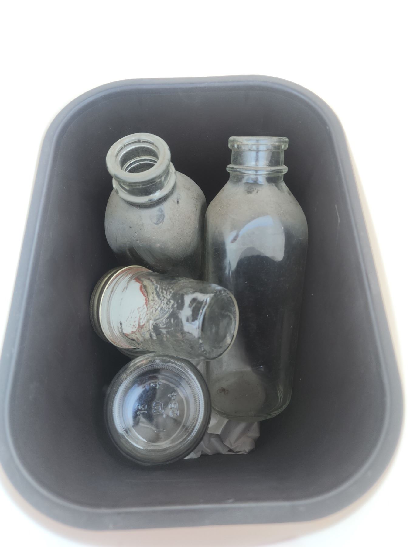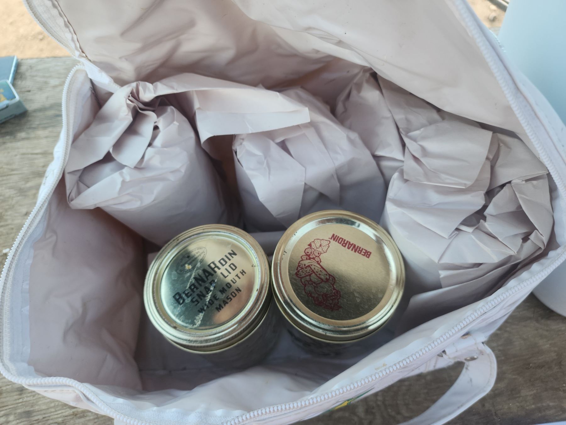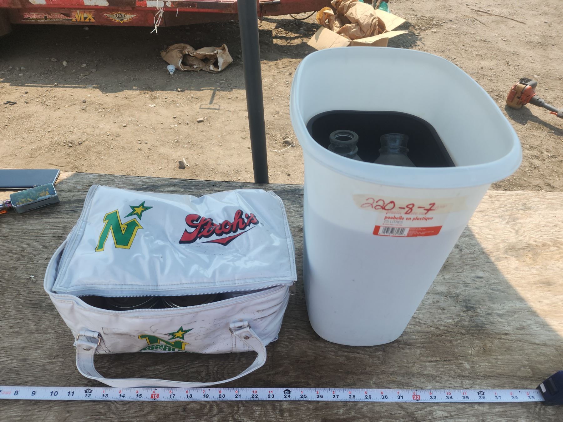 Cooler bag, garbage cans, w/ jars and bottles