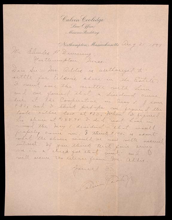 Coolidge, Calvin (1872-1933) 30th President of the United States (1923-1929). Early autograph letter signed as a young lawyer (he was admitted to the bar in Massachusetts in 1897), 1 page, on his legal letterhead, 10¾ x 8¼", Northampton, Mass., Aug. 21, 1899. To Charles H. Dunning, regarding a change in the settlement of an estate. "…If you think that fair bring me in a check for that amt. and I will secure the release…." Normal folds and light toning. Accompanied by an engraving of Coolidge.