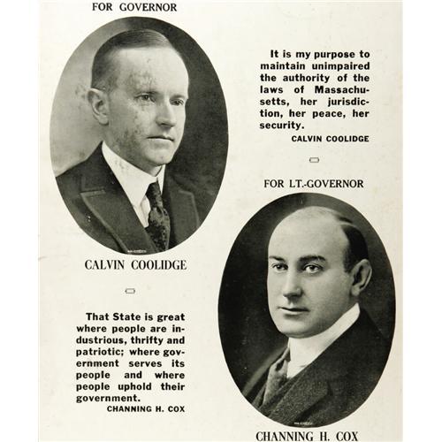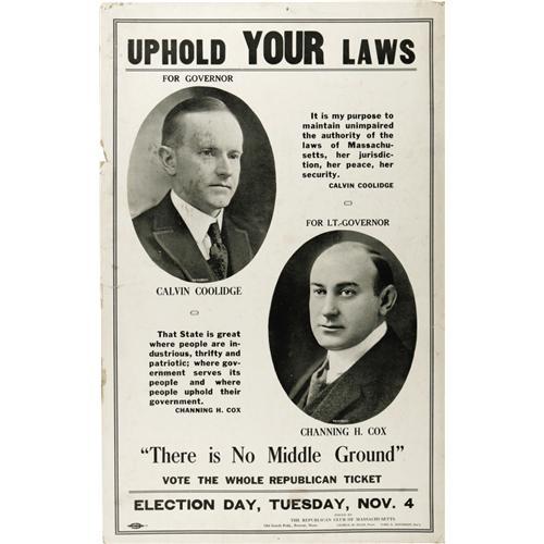 <B>Coolidge & Cox Gubernatorial Campaign Poster,</B></I> "Uphold Your Laws", 13.75" x 21.75". Calvin Coolidge's short term as Governor of Massachusetts commenced in 1919 and ended the following year when he successfully ran for vice president under Warren G. Harding. This rare poster carries images of both Coolidge and his running mate, Channing H. Cox. Normal aging, chipping along left margin, perforation in top margin. Good condition.<BR><BR><b>Shipping:</b> Large Flat (<a target="_blank" href="http://www.heritageauctions.com/common/shipping.php">view shipping information</a>)