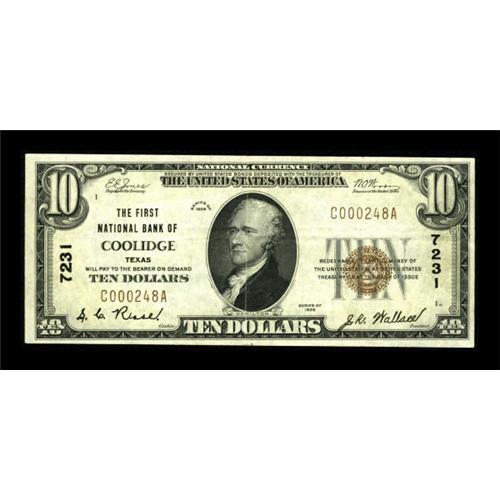<B>Coolidge, TX</B></I> - $10 1929 Ty. 1 <B>The First NB</B></I> Ch. # 7231<BR> This is a nice <B>Very Fine+</B></I> $10 on this Limestone County bank.<BR><BR><b>Shipping:</b> Coins & Currency (<a target="_blank" href="http://www.heritageauctions.com/common/shipping.php">view shipping information</a>)
