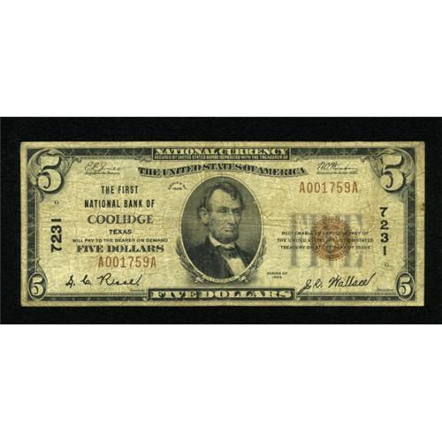 <B>Coolidge, TX</B></I> - $5 1929 Ty. 1 <B>The First NB</B></I> Ch. # 7231<BR> From our Central States Final Session where it was cataloged, "We sold a small size in a similar grade on this bank in January 2005 for a little over $400. <B>Very Good</B></I>."<BR><BR><b>Shipping:</b> Coins & Currency (<a target="_blank" href="http://www.heritageauctions.com/common/shipping.php">view shipping information</a>)