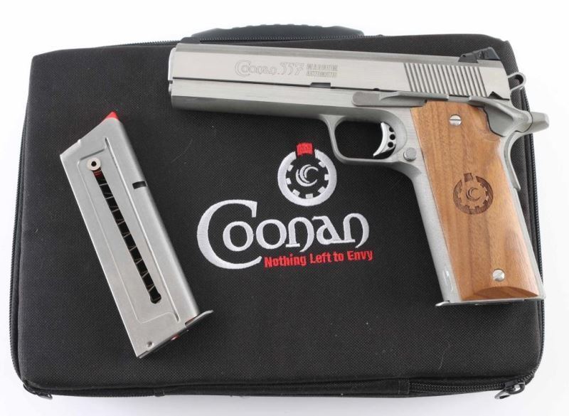 'Model B' Semiautomatic pistol with 1911 styling, built to fire 357 Magnum cartridges. Features stainless steel construction, smooth wood grips with Coonan logo, single action trigger, 5" barrel, dovetailed three dot sights with adjustable rear sight, manual safety, grip safety, push button magazine release. Bore is very good condition. External appearance is near new with few handling marks. Includes black leather foam lined soft case with Coonan logo, manual, (2) magazines total. Condition is NRA Excellent - like new *** Modern Firearm ***