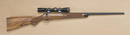 Cooper Arms model 21 short bolt-action rifle in .223 caliber, with high-grade select burl wood stocks, fancy checkered, engraved action and triggerguard, QD mounts also engraved to match with Leopold 2.5x8 power scope. Frame is stamped “Millek 1”. The rifle shows a slightly heavy tapered barrel and fine quality craftsmanship throughout with beautiful stocking and grain and milled-steel buttplate. The condition is fine to excellent with just slight use, minor storage marks. A superior rifle in every respect that shows high quality hand workmanship. From the Robert Petersen Collection. Est: $1,250 - $2,500