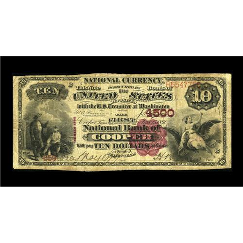 <B>Cooper, TX</B></I> - $10 1882 Brown Back Fr. 484 <B>The First NB</B></I> Ch. # 4500<BR>This is one of only two Brown Backs recorded from this very scarce bank, with the other grading only Good-Very Good. It traces its pedigree to the Irish holdings, and realized just over $4000 the last time it sold, about right for a Brown Back from a tough "large only" bank. Pen signed <B>Fine.</B></I><BR><BR><b>Shipping:</b> Coin/Currency (<a target="_blank" href="http://www.heritageauctions.com/common/shipping.php">view shipping information</a>)
