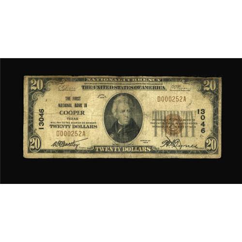 <B>Cooper, TX </B></I>- $20 1929 Ty. 1 <B>The First NB</B></I> Ch. # 13046<BR> While this Delta County locale supported no less than four national banks at various times during the issuing period, only two ordered the 1929 series, with this institution chartered late enough that its issue was confined to that design. It leaves a census of only seven examples, with this newly reported <B>Very Good-Fine</B></I> exhibiting a few pinholes.<BR><BR><b>Shipping:</b> Coins & Currency (<a target="_blank" href="http://www.heritageauctions.com/common/shipping.php">view shipping information</a>)