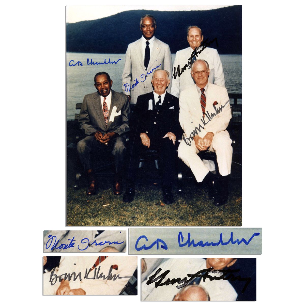 8'' x 10'' photo signed by several baseball Hall of Famers. In this undated glossy photo from a Cooperstown Hall of Fame induction ceremony, Monte Irvin, A.B. ''Happy'' Chandler and Bowie Kuhn sign underneath their respective images. Gene Autry, then owner of the California Angels and American League Vice President, also signs. Near fine condition.