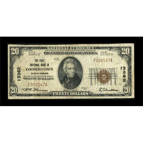 <B>Cooperstown, ND</B></I> - $20 1929 Ty. 1 <B>The First NB</B></I> Ch. # 13362<BR> The previous president for this bank was H.P. Hammer, while the cashier on this note is R.A. Hammer. A solidly margined note. <B>Fine</B></I>. <BR><I>From The Kansas City Collection.</B></I><BR><BR><b>Shipping:</b> Coins & Currency (<a target="_blank" href="http://www.heritageauctions.com/common/shipping.php">view shipping information</a>)