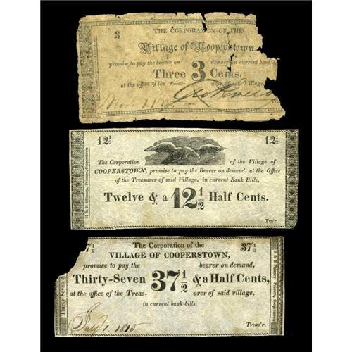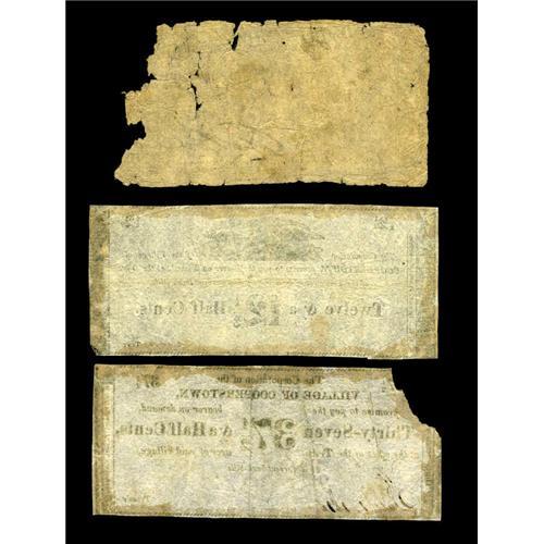 <B>Cooperstown, NY- Village of Cooperstown</B></I> 3¢, 12 1/2¢, 37 1/2¢ Harris 12, 16, 18<BR>Three pieces, the 3¢ low grade and missing its right end, but in a different form than the two higher denomination pieces, and dated Nov. 11, 1815, the 12 1/2¢ <B>Very Fine</B></I> but unissued, the 37 1/2¢ with a corner missing but dated July 1, 1815, otherwise <B>Fine.</B></I> Ex-Harris collection sale, lot 844.