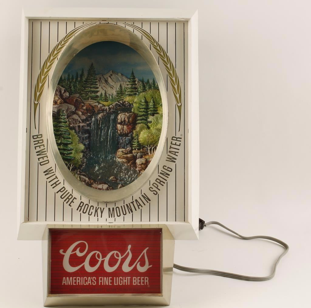 Electric Coor's Beer advertising sign. Features a lit mountain spring scene with animated waterfall. Reads "Brewed with pure Rocky Mountain spring water". A neat old beer advertiser. Condition is good.