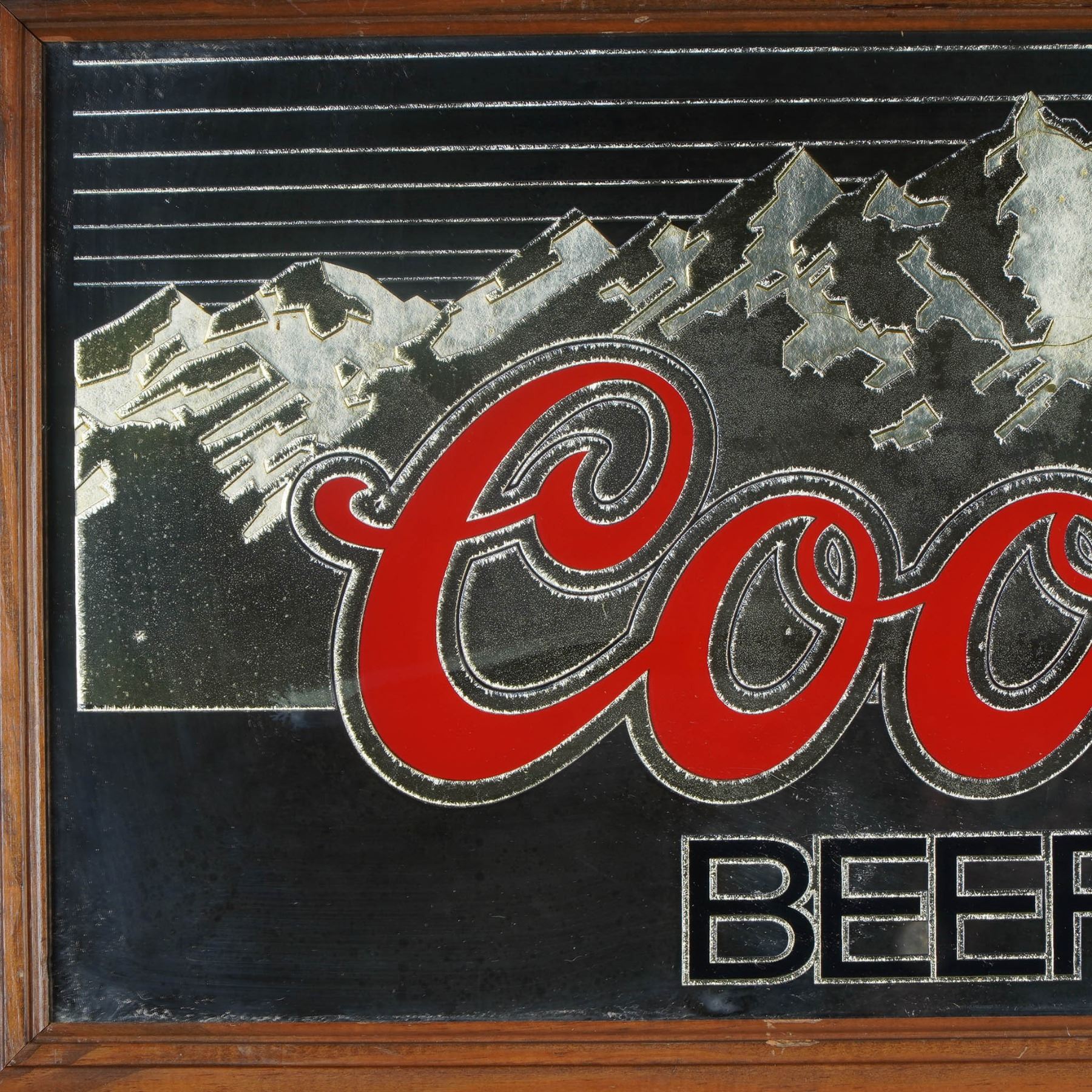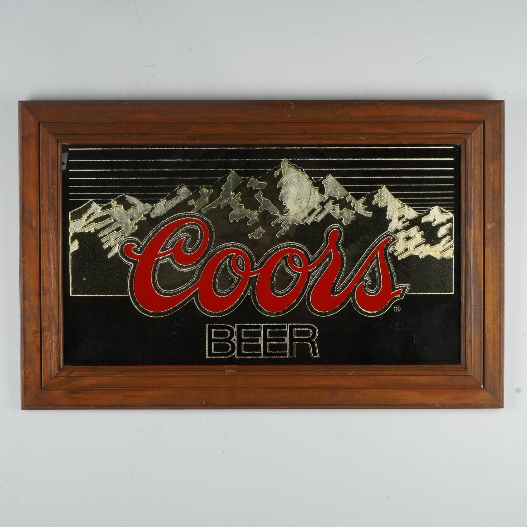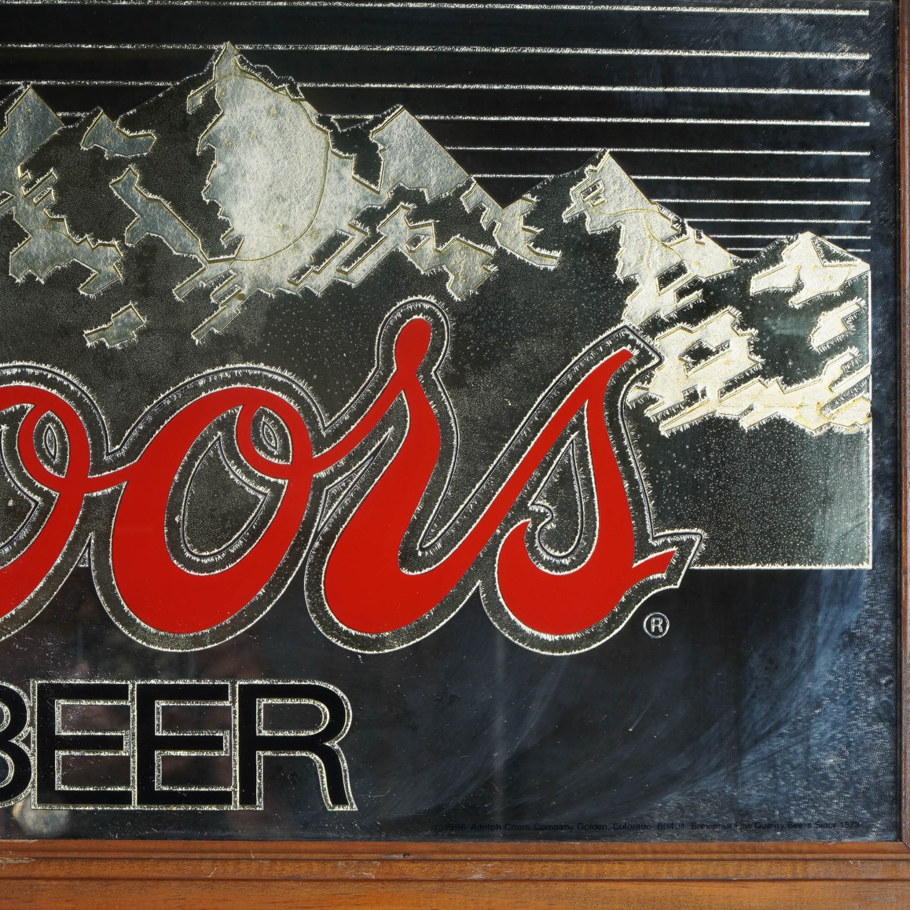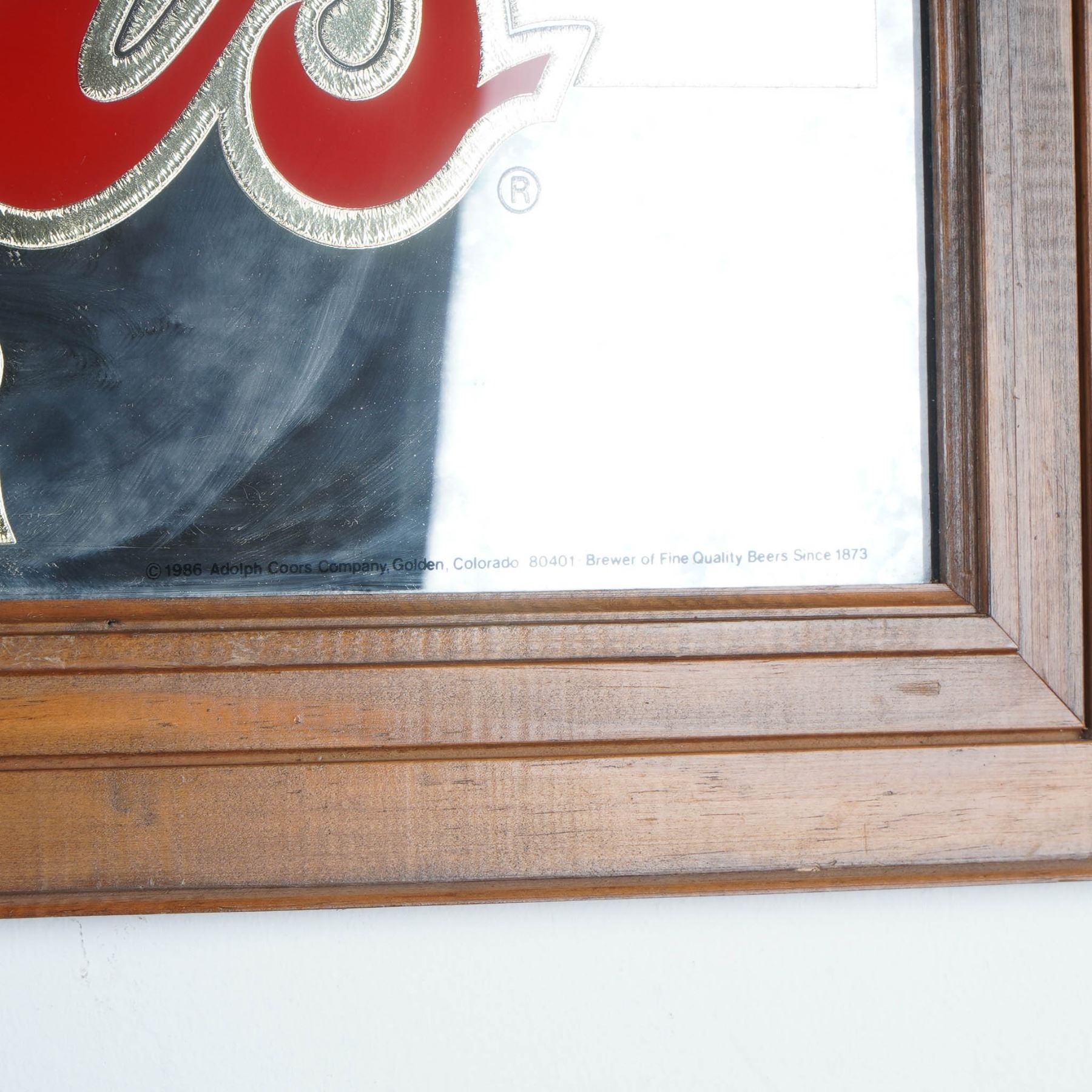 Vintage advertising mirror featuring the iconic Coors Beer logo in bold red script with gold accents, set against a mountainous landscape and horizontal stripe design. Produced by the Adolph Coors Company and dated 1986, this piece celebrates the brewer's heritage with the inscription Brewer of Fine Quality Beers Since 1873. Housed in a sturdy natural wood frame, this classic bar mirror makes an excellent display piece for collectors of breweriana.
