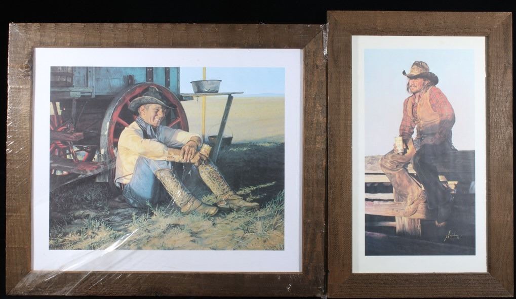 Available in this lot we have a Coors cowboy framed advertising posters by Gordon Snidow originating from the 1970's to 1980's. This first print features a cowboy in a red checkered shirt, chaps, leather vest, and iconic cowboy hat while holding a Coors beer and sitting on a fence. The second print shows a cowboy seated with his back resting against a chuck wagons wheel and holding a Coors can in his hand. These prints are two of several in the Coors Cowboy Collectors Series by Gordon Snidow. The series was produced in the 1970's and 1980's and was a successful advertising campaign for Coors. In addition, Sindow has been a charter member of the Cowboy Artist of America where he served in many positions including president of the association. The pieces are framed in a rustic wooden frame and are signed "G Snidow" in the bottom right corner. The prints show good condition overall with little to no wear and the second shows most of its original plastic wrap. The first frame measures 19" wide by 29 1/2" tall, with the second measuring 32 1/2" wide by 28" tall..