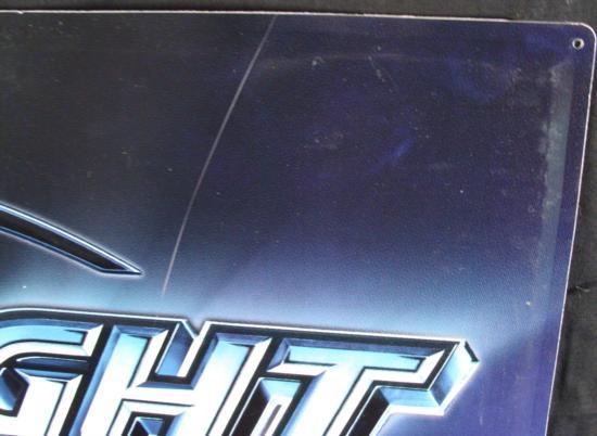Coors Light became a sponsor for the NFL, and they designed this metal beer sign with great big football logo in raised detail. There is a stadium in the background, glowing with lights. This sign came out in 2006. It is 22 1/4" x 26". Holes at the corners allow it to be easily tacked to a wall. It is in very good condition, with a slight scratch.
