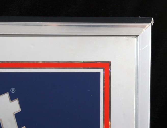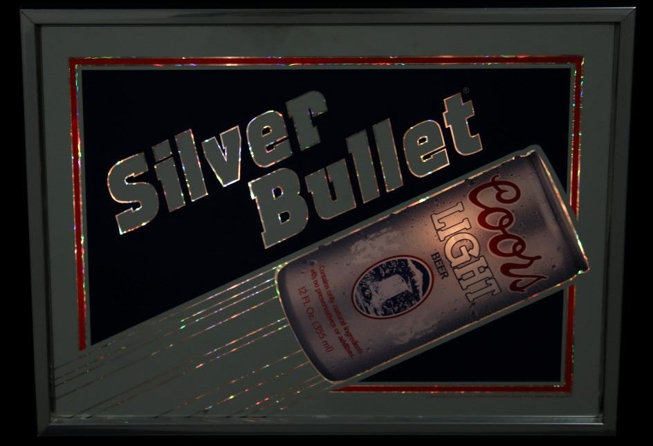 Offered in this lot we have a Coors Light Silver Bullet light up advertising sign originating from the 1980's. This sign shows a mirror with a dark blue rectangle at the center with a red border. The piece is marked "Silver Bullet" with a can flying at an angle reading "Coors Light Beer - Contains only natural ingredients with no preservatives or additives" with a water fall logo. The bottom of the sign is marked "1988 Adolph Coors Company. Golden. Colorado 80401. Brewer of Fine Quality Beers Since 1873". The sign shows good condition overall with some light wear. It measures 19 1/2" wide by 14 1/4" tall.