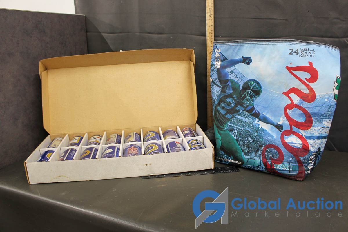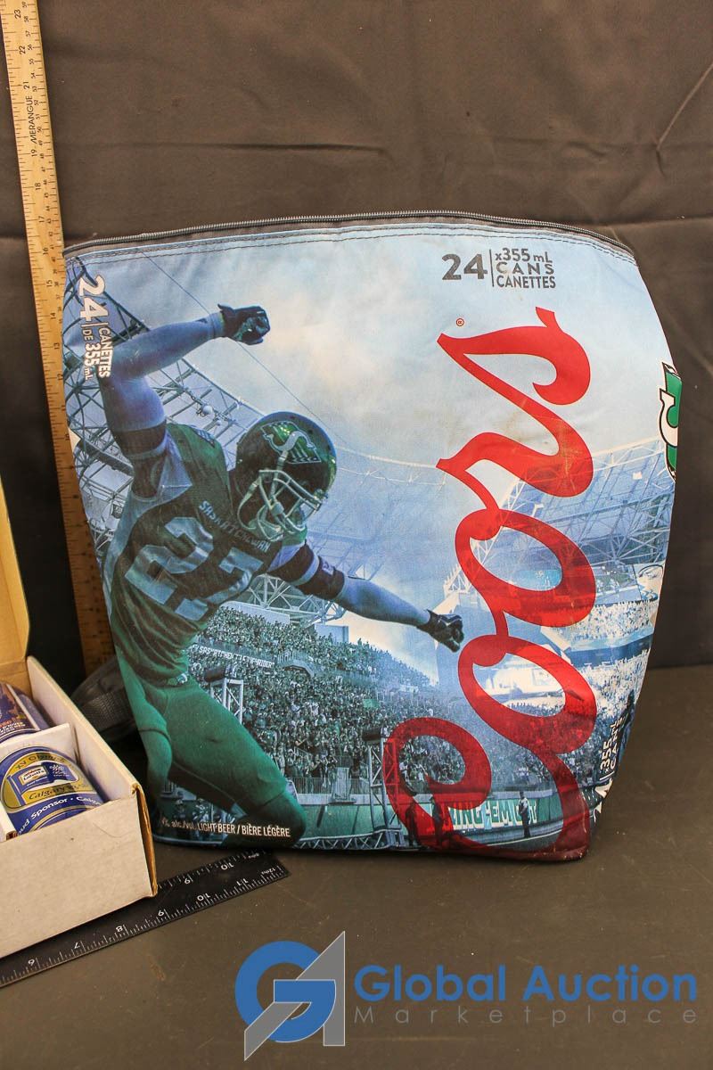 Coors Sask Roughrider Cooler Bag and Labatts Case Of Olympic Beer (Full)