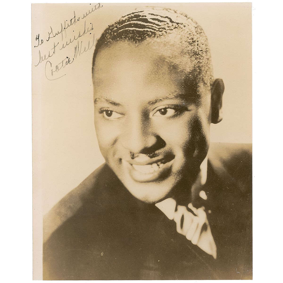 Jazz jump blues trumpeter (1911–1985). Vintage glossy 6.5 x 8.25 photo, signed and inscribed in black ink, “To Griffith, with best wishes, Cootie Williams.” In very good condition, with scattered creases (most noticeably a horizontal bend at eye-level) and uniformly trimmed edges.