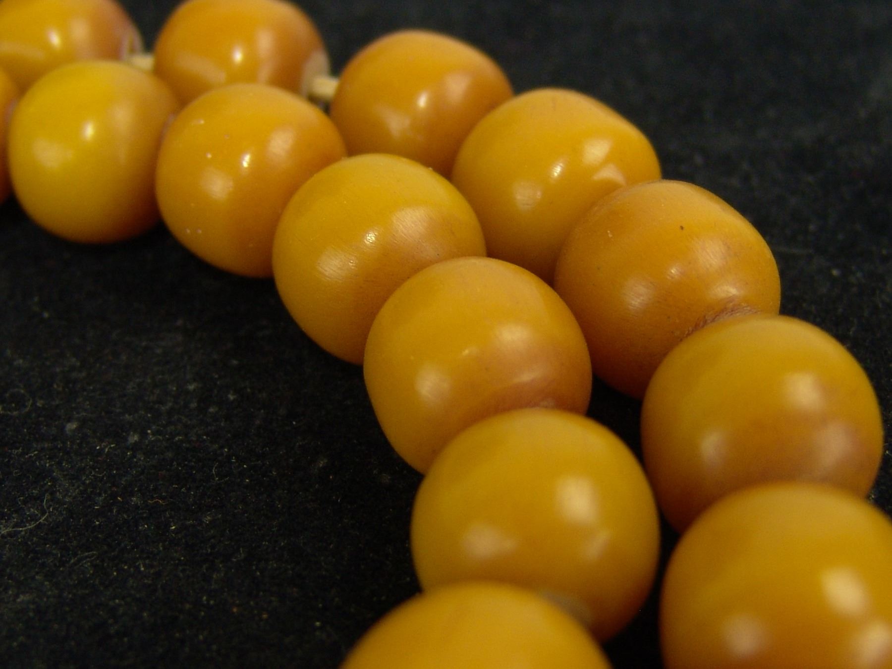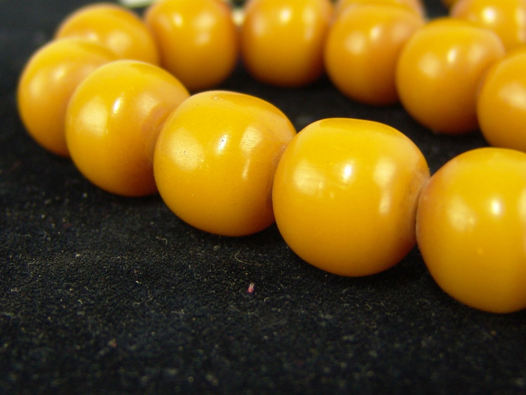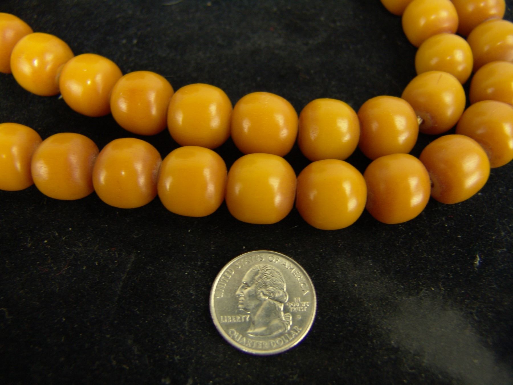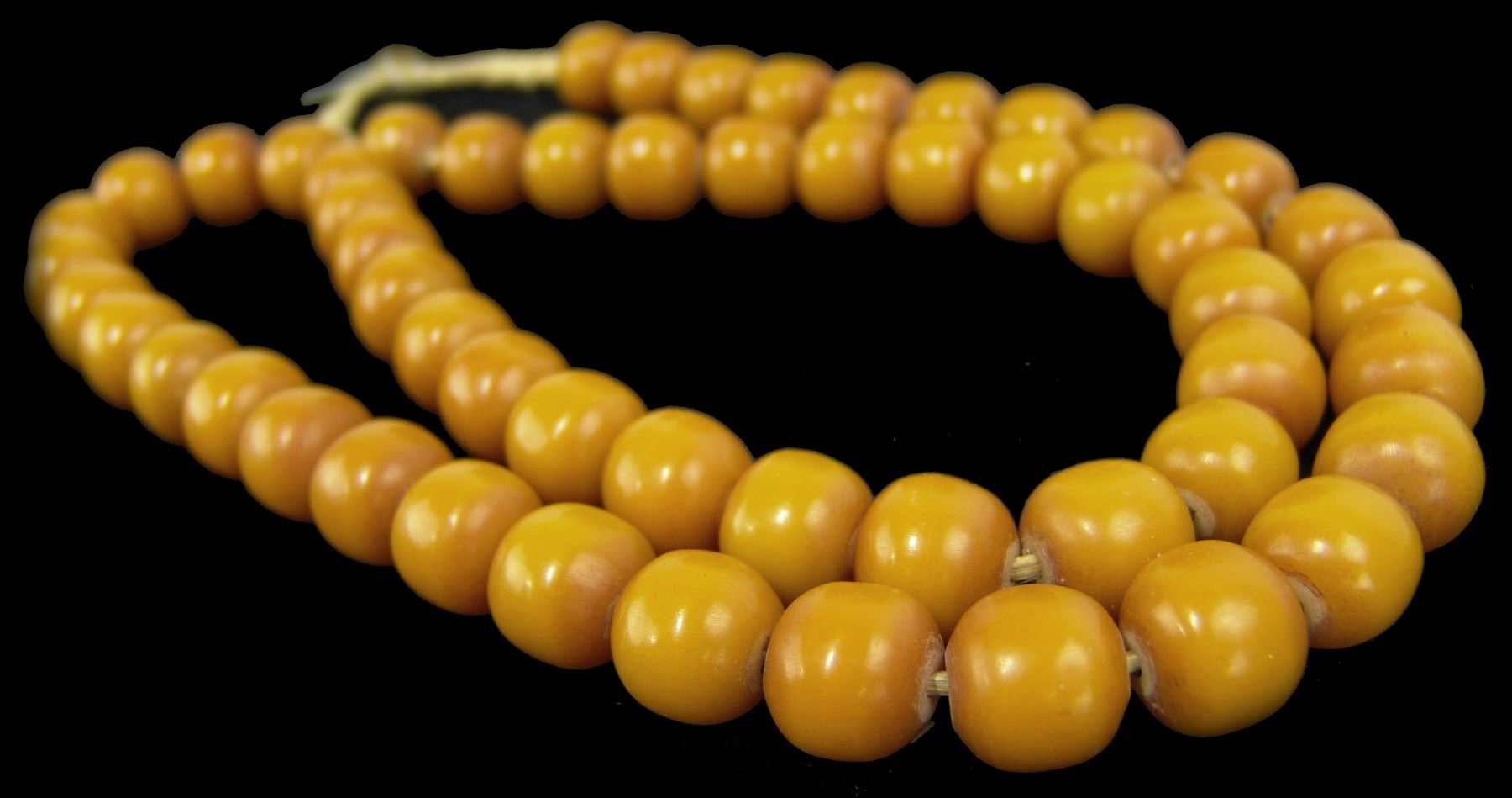 Beautiful extra long strand of uniform colored yellow rounded barrel-shapped beads in butterscotch color. Very good condition, beautiful patina. 53, 5/8" beads., Mid 1900s, 36"