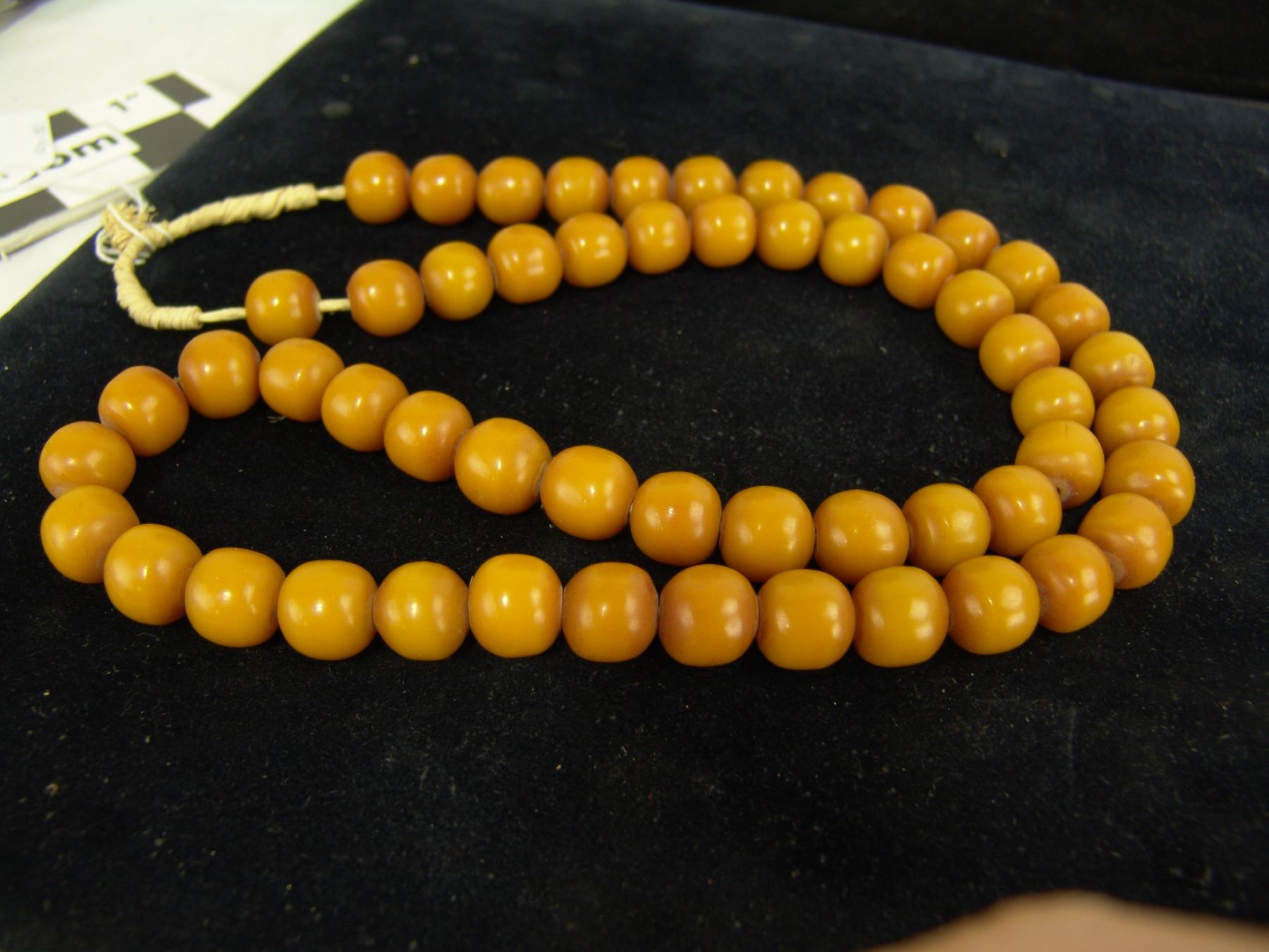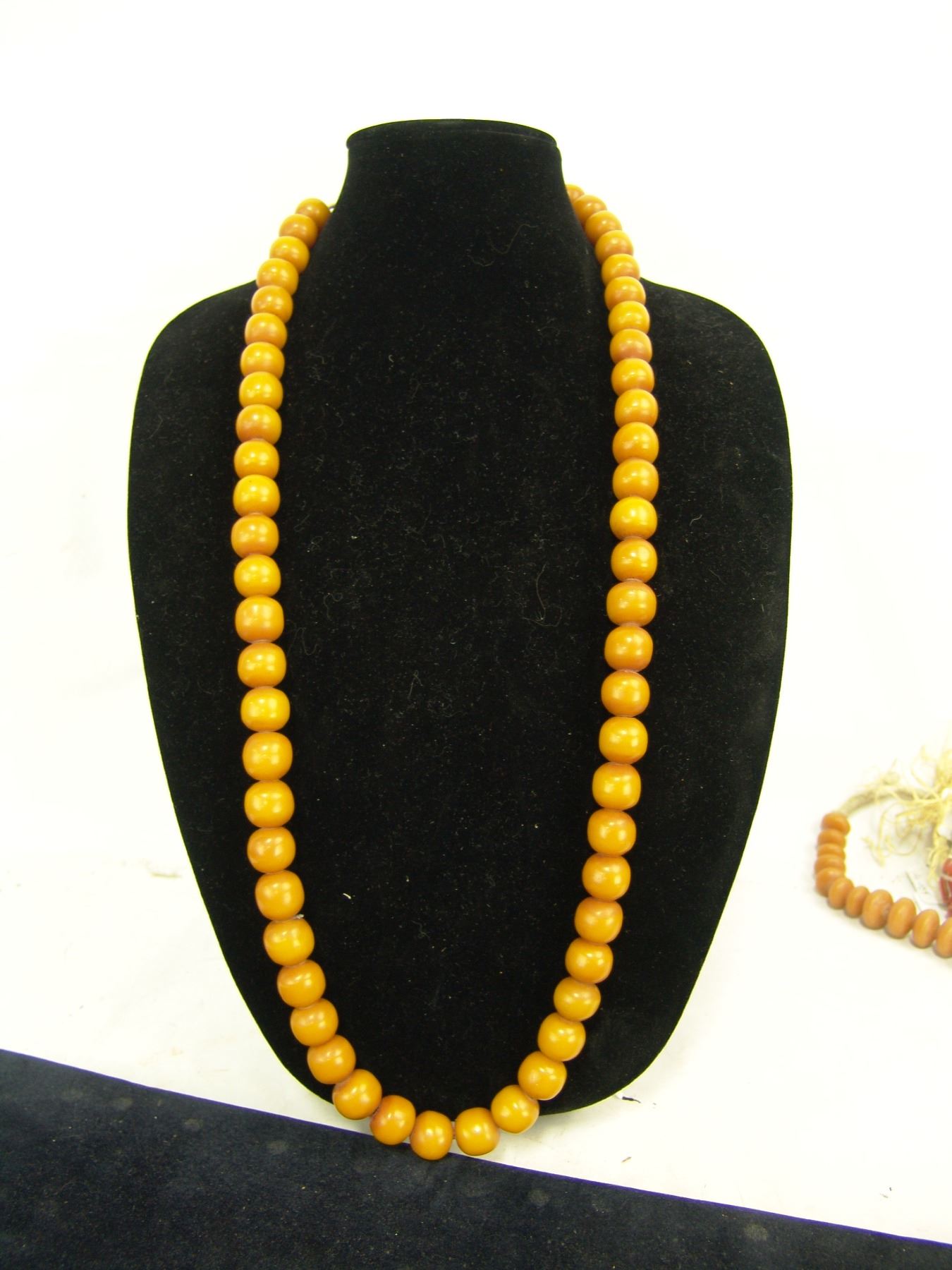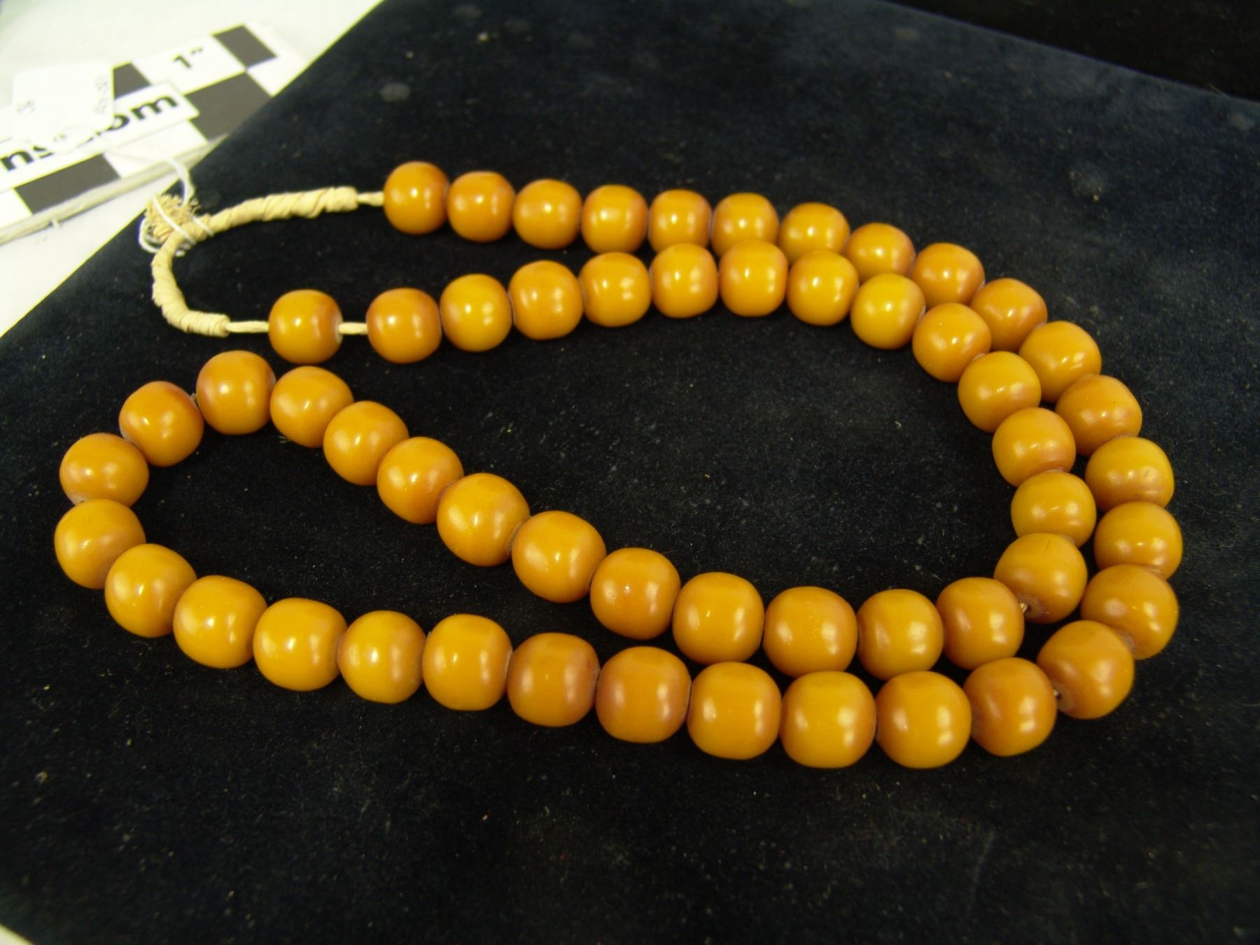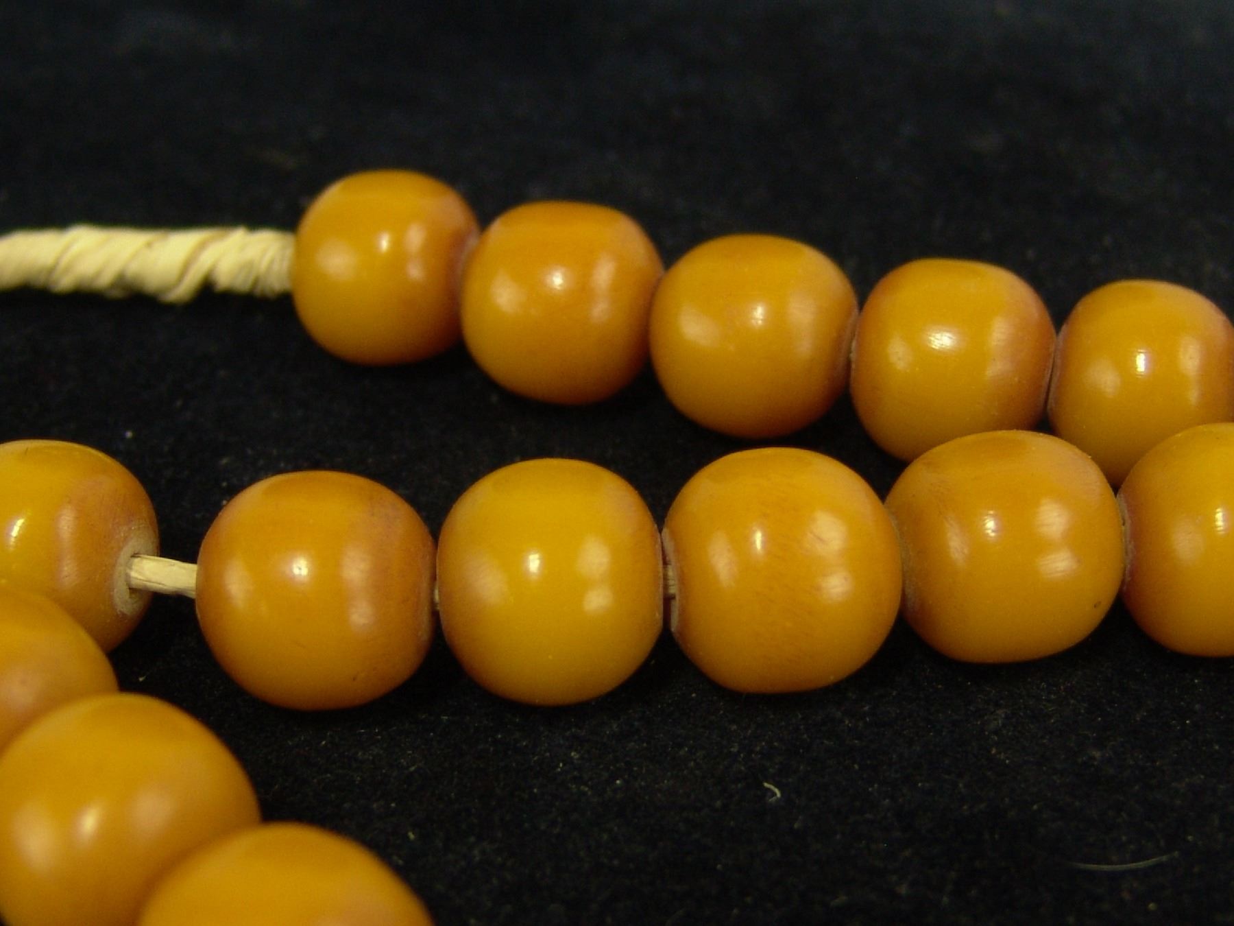 Beautiful extra long strand of uniform colored yellow rounded barrel-shapped beads in butterscotch color. Very good condition, beautiful patina. 53, 5/8" beads., Mid 1900s, 36"
