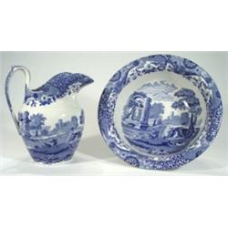 Copeland Spode jug and basin, transfer printed with blue and white Italian pattern, impressed and printed marks to bases
