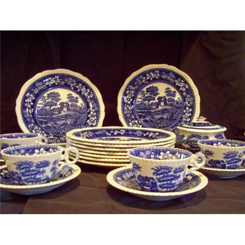 </font></strong>Beautiful deep blue on white 18 piece set of china in the Spode's Tower pattern. This English transferware has the old blue oval with incised marks on the back. According to the stamp on the back, This group dates to 1930. The set includes; (9) 9 1/2" Dinner plates, 5 have underside chips, Not visible from the top. 4 are very good. (1) Covered sugar bowl, Base is excellent, The lid has 2 underside chips and a crack on the inside rim. The top has a flat chip that is hard to see. Lid is still sturdy. (4) Cups in very good condition, And (4) saucers, All have underside chip that are not visible from the top. there is no crazing on any of the pieces. Vibrant color on this pattern is amazing. The condition of this set is concurrent with it's age. </font>