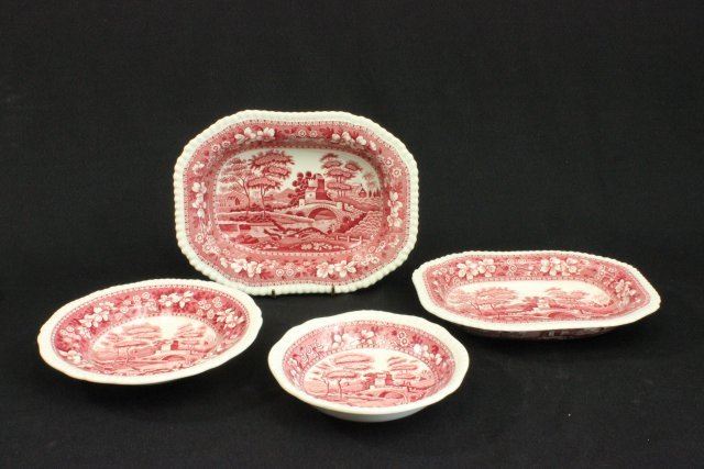 Including (12) 10 3/4" dinner plates, (12) 9 1/4" plates, (15) 7 5/8" plates, some Spode, (12) 7 3/4" soup bowls, (12) 6 1/2" plates, (13) 6 1/4" bowls, some Spode, (8) 7" plates, (4) platters, (2) coffee pots, (2) creamers, sugar dish, (3) egg cups, (13) cups, (8) bullion cups. Total 154 pieces. Flakes. Some chips. Losses.