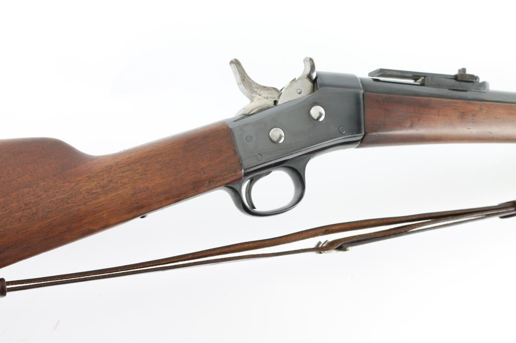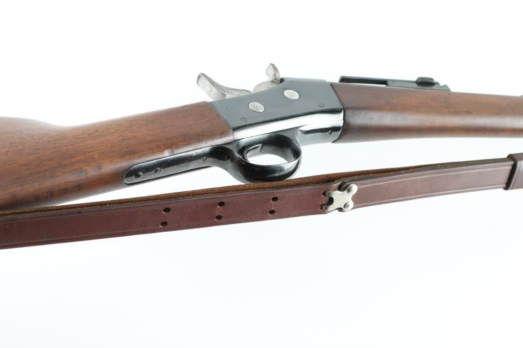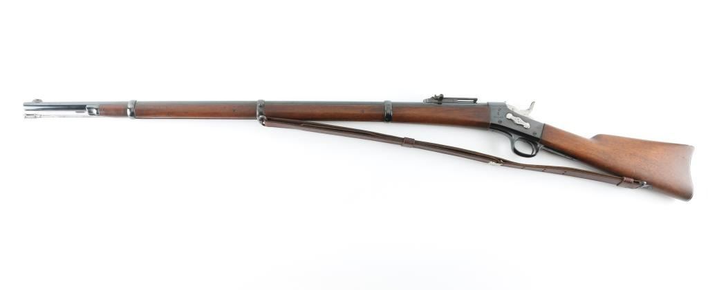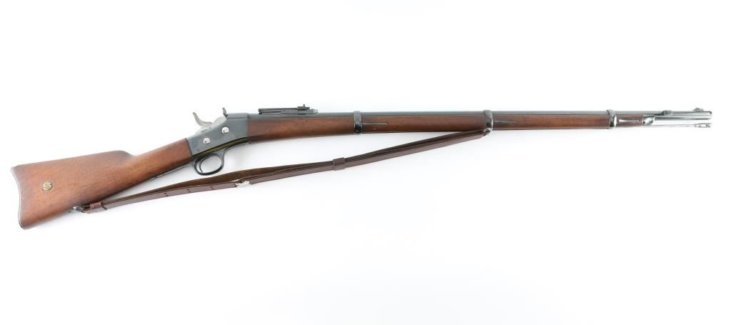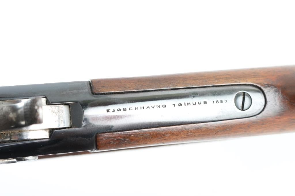 Danish military single shot breech loading rolling block rifle chambered in 11.7x42Rmm Danish/Remington, manufactured at the Copenhagen Arsenal in Denmark circa 1880. Rifle has been refinished. Features a re-blued finish, 35.5" barrel with bayonet bar, dovetailed inverted 'v' front sight, flip-up ladder style rear sight graduated to 1,400 meters, steel cleaning rod, three barrel bands, smooth trigger, knurled hammer spur, smooth wood forend and straight grip shoulder stock with brass stock disc & metal carbine buttplate. Bore appears very good/bright. Action is smooth/tight. Re-blue is about 85% with handling wear on the receiver. There is some surface rust on the rear sight. Re-finished wood is near excellent. Incorrect leather sling attached. NRA Condition-Near Excellent/Re-finished. Antique firearm