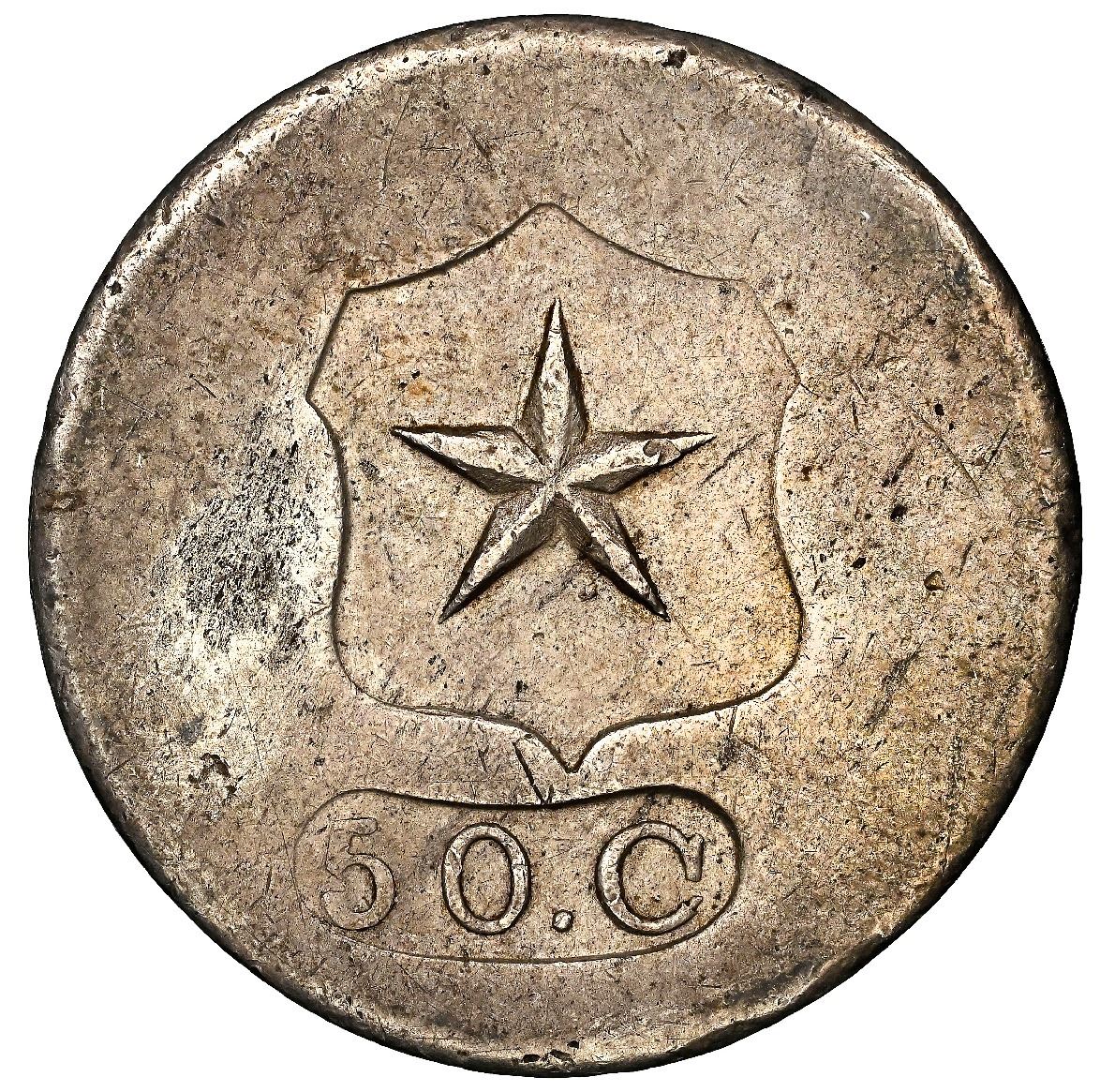 Copiapo, Chile, uniface 50 centavos, (1859), star in relief inside wide shield, NGC AU 53.