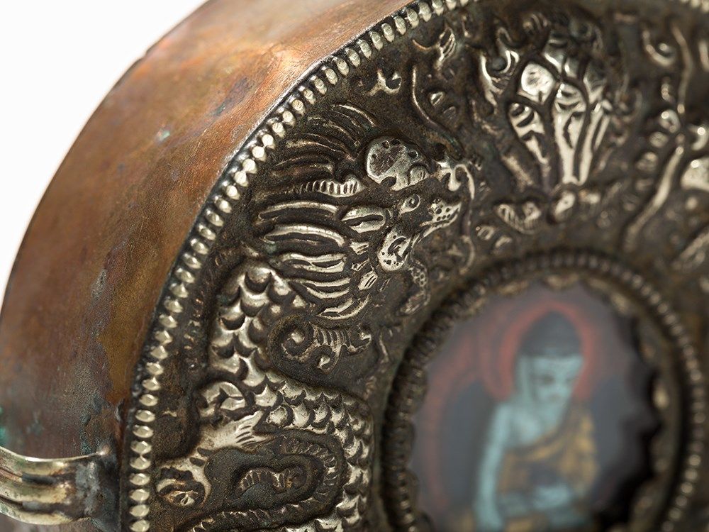 This Tibetan amulet box, called ‘ga’u’, has an intricately embellished metal front, which is decorated by a decor in the high relief. Two dragons, with their heads facing the jewel of desire, Cintamani, and the face of a mythical creature on the bottom, make up the front. Through the glass in the middle of the gau, a small Tsa-Tsa Buddha, made of stone on silk, becomes visible. The body is made of copper and the chased banner of victory can be seen on the copper back.