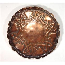Copper Arts and Crafts dish with fluted edge, embossed with stylised leaves, 20cm diameter