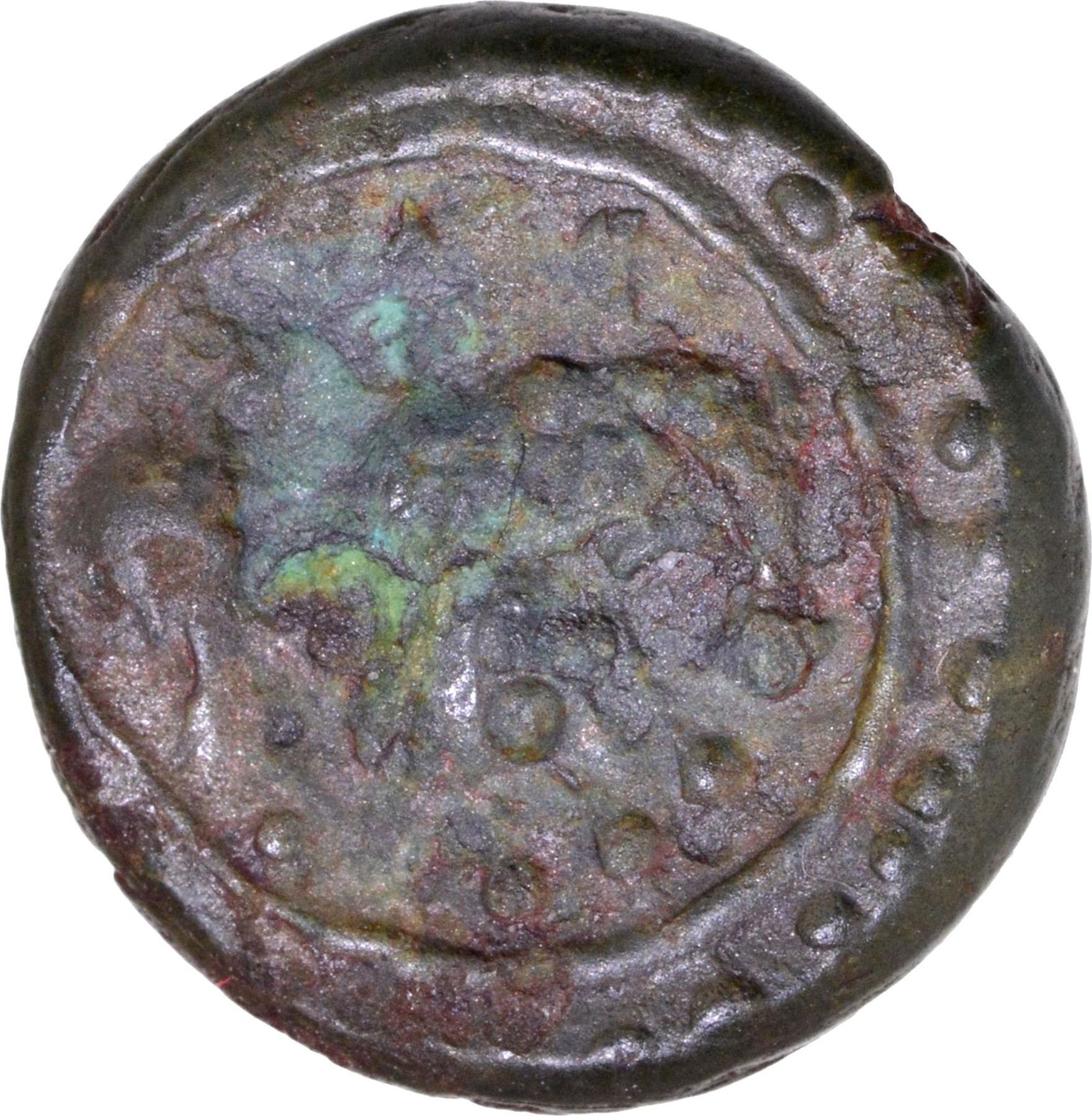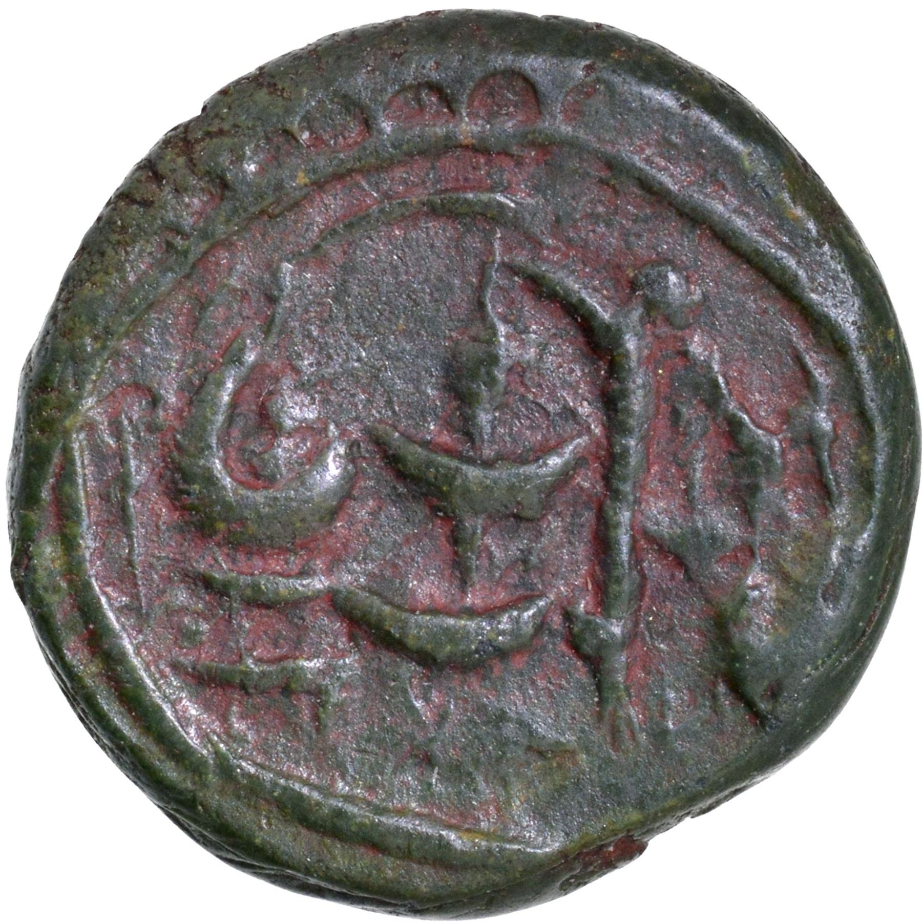 Vishnukundin Dynasty (450-615 CE), Vidarbha Region, Copper Base Alloy Unit, Shivalinga type, Obv: a roaring lion standing facing the right with an upraised tail, a linear border surrounded by dots around the field, Rev: a Shivalinga with Naga in the center, a conch shell (Shankha) to the left and a sword to the right, a linear border around the field, 2.20g, 12.87mm, (Unlisted in major numismatic references), about extremely fine, Very Rare.