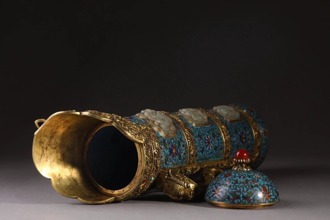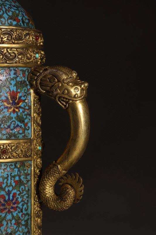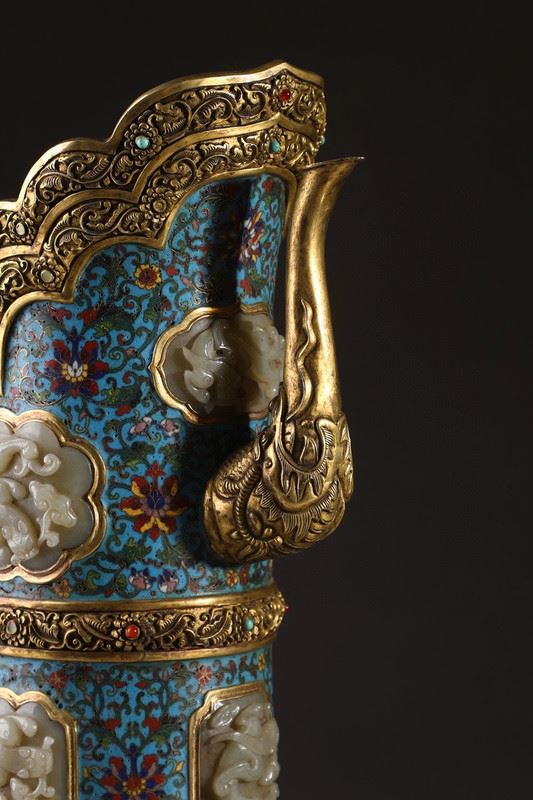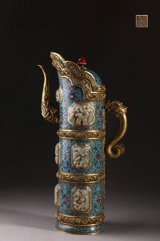 This copper-based cloisonné enamel teapot features exquisite craftsmanship, blending the elegance of cloisonné with the noble texture of Hetian jade. The distinctive multi-mu teapot design showcases intricate cloisonné techniques, adorned with vibrant enamel colors, and inlaid with Hetian jade for added prestige. The lid is embellished with a red gemstone, and the overall design exudes a sense of ancient elegance, reflecting the sophisticated artistry of Qing Dynasty craftsmanship.