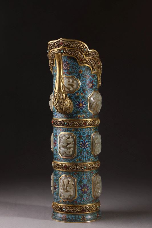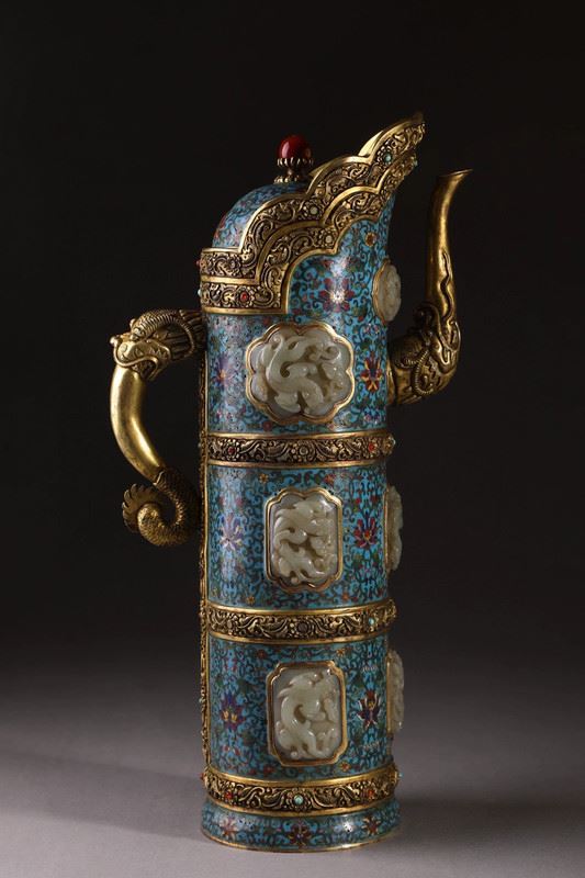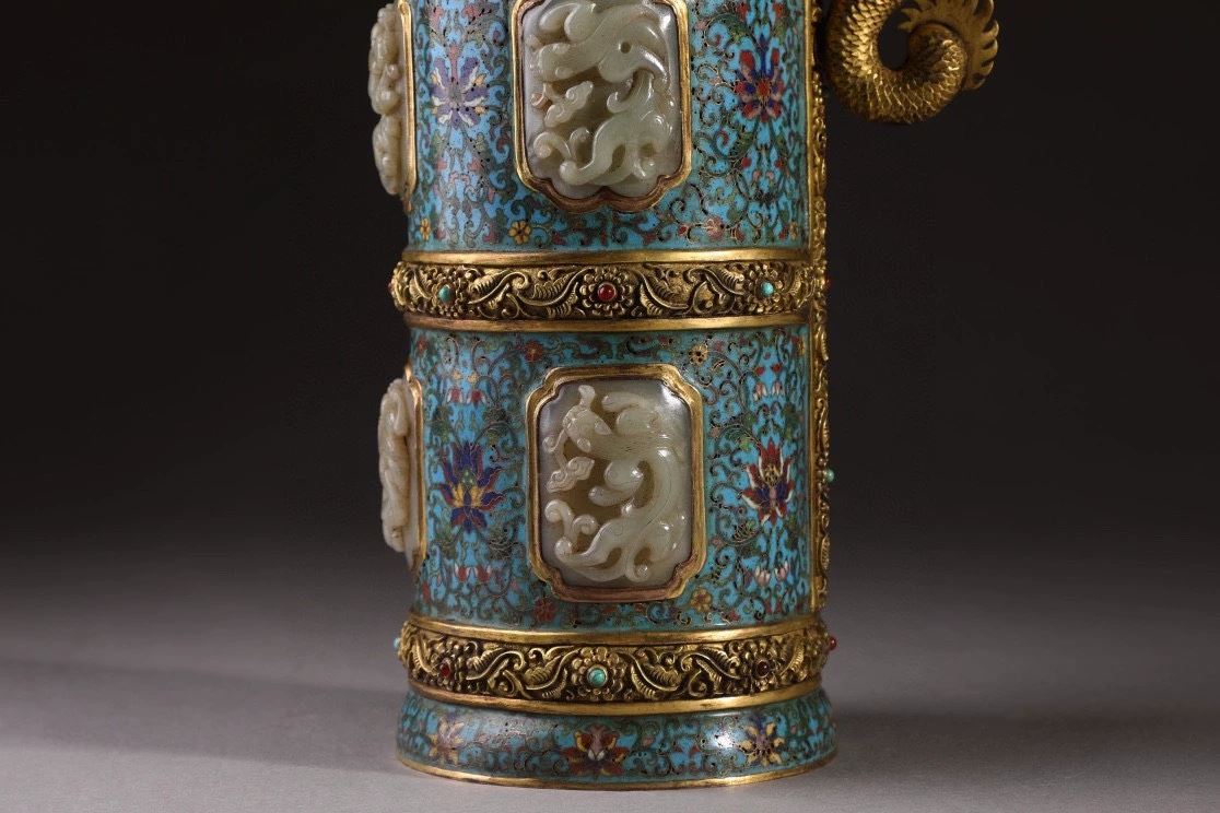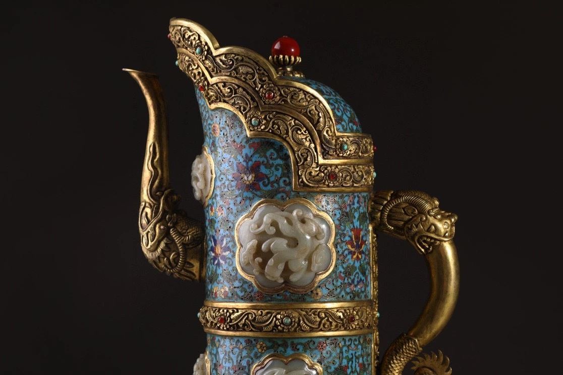 This copper-based cloisonné enamel teapot features exquisite craftsmanship, blending the elegance of cloisonné with the noble texture of Hetian jade. The distinctive multi-mu teapot design showcases intricate cloisonné techniques, adorned with vibrant enamel colors, and inlaid with Hetian jade for added prestige. The lid is embellished with a red gemstone, and the overall design exudes a sense of ancient elegance, reflecting the sophisticated artistry of Qing Dynasty craftsmanship.