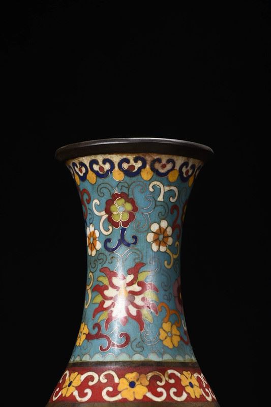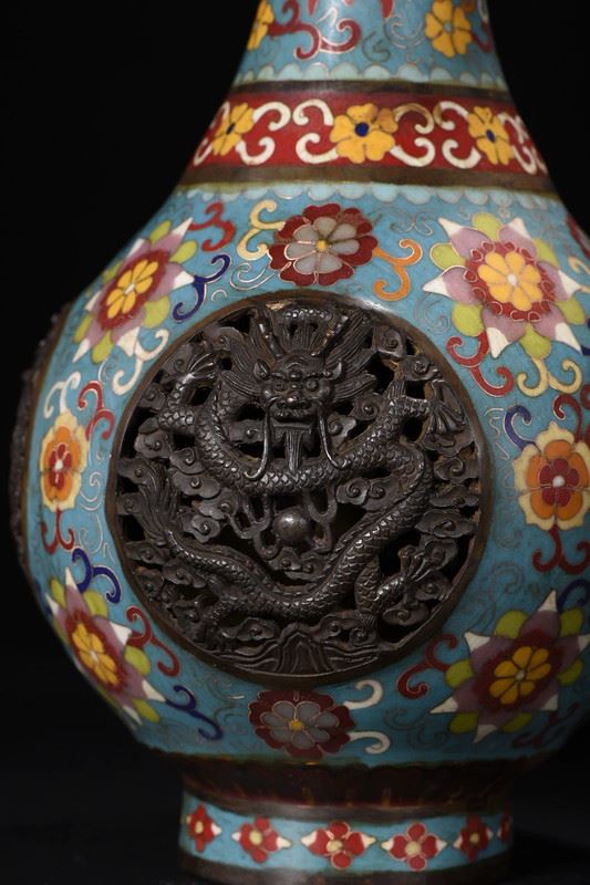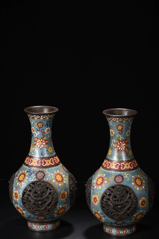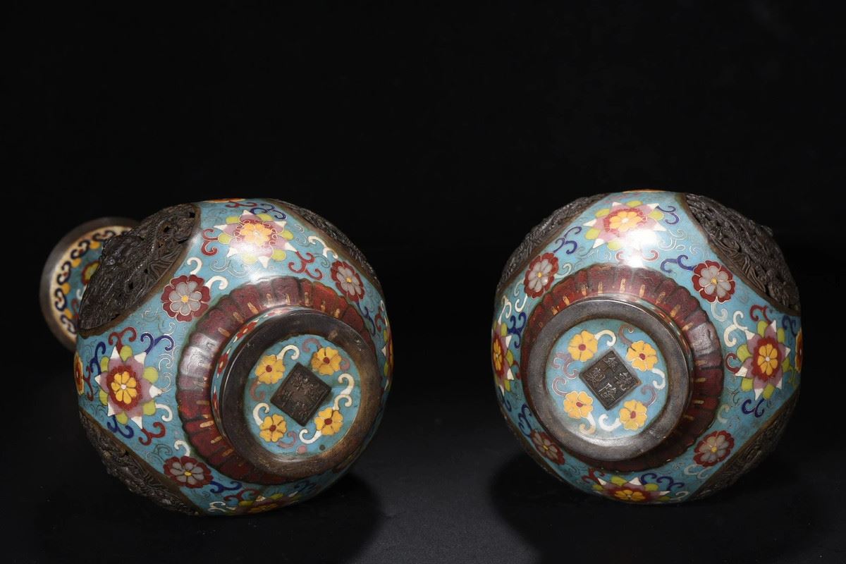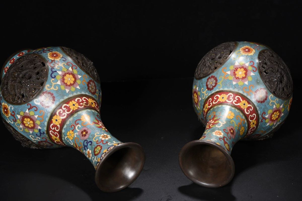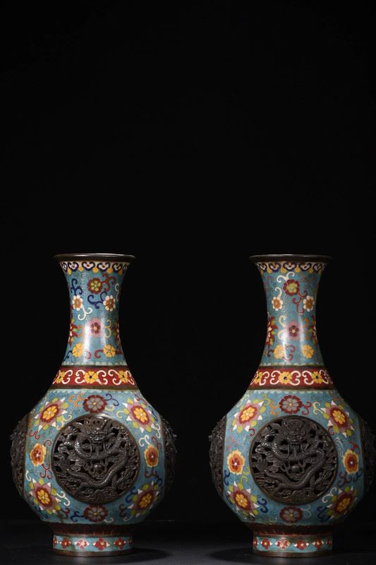 This pair of copper-based cloisonné dragon motif vases exemplifies the exquisite combination of traditional Chinese metalworking and cloisonné art. The body of the vases is crafted from copper, covered in vibrant cloisonné enamel, adorned with intricate dragon and floral patterns. The dragons, vivid and powerful, symbolize royal majesty and good fortune. The colors of the vases are rich and layered, with a predominantly blue background contrasted by red, yellow, and green, giving the design an elegant and sophisticated appearance. The gilded accents at the top and bottom of the vases enhance their visual impact. This pair is not only a functional art piece but also a highly valuable collectible.