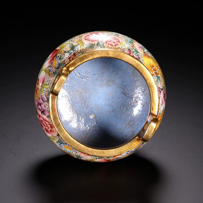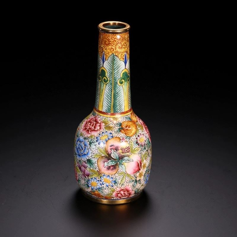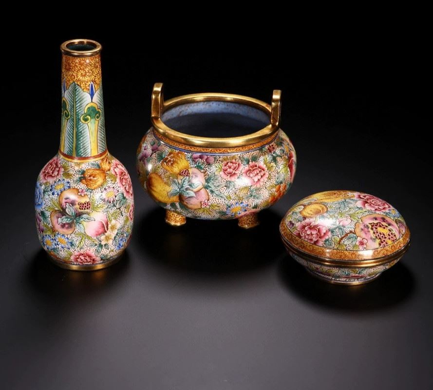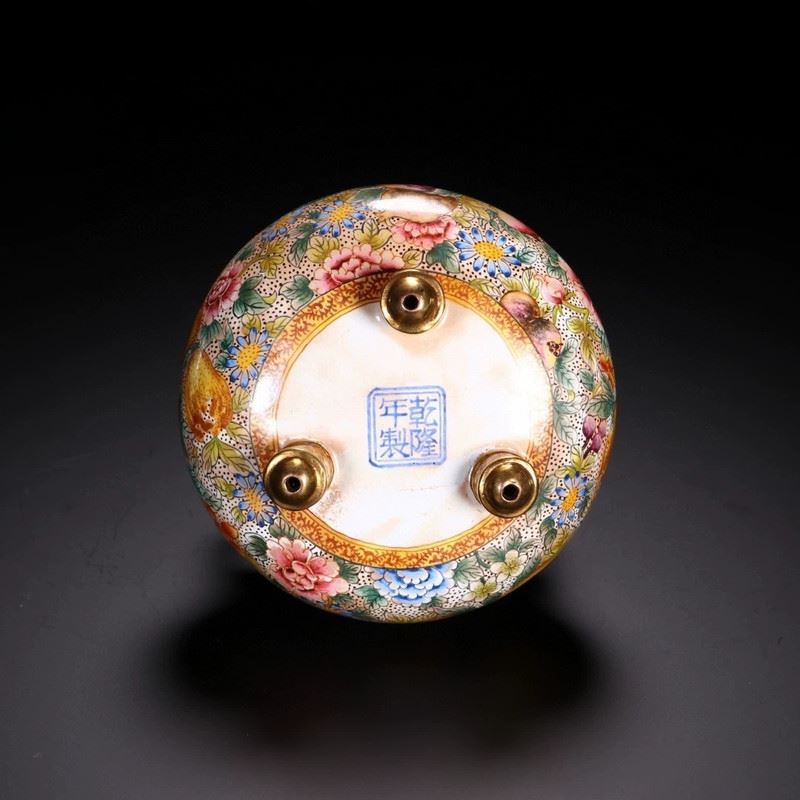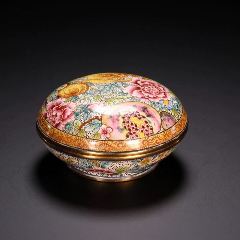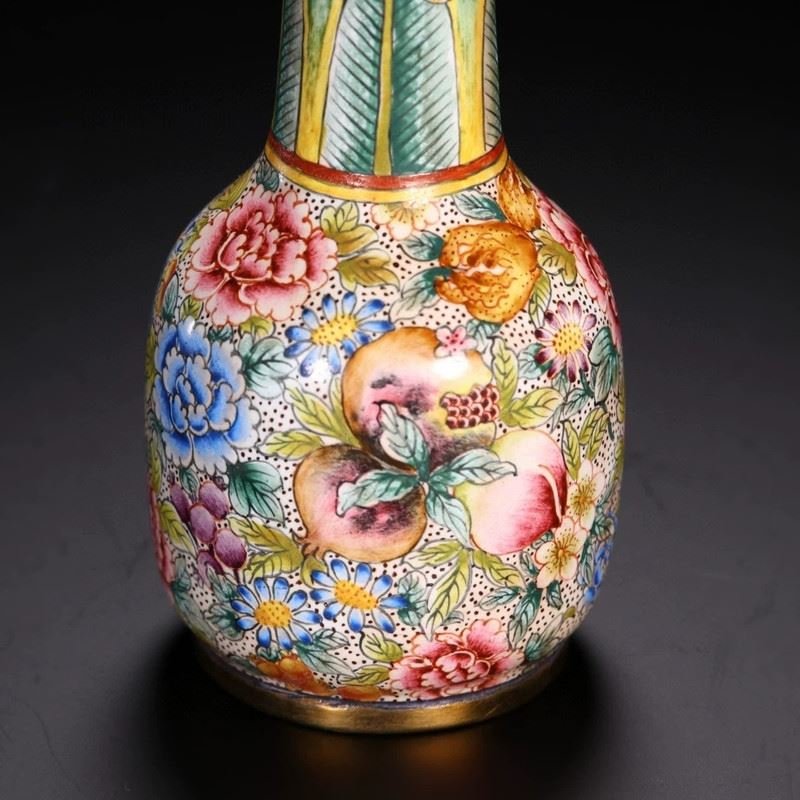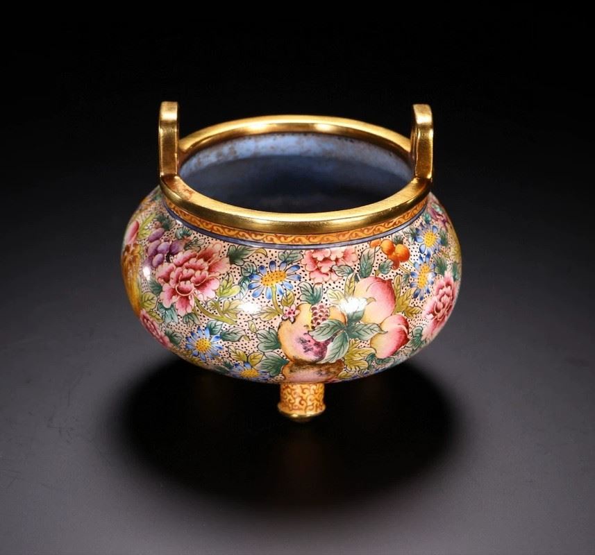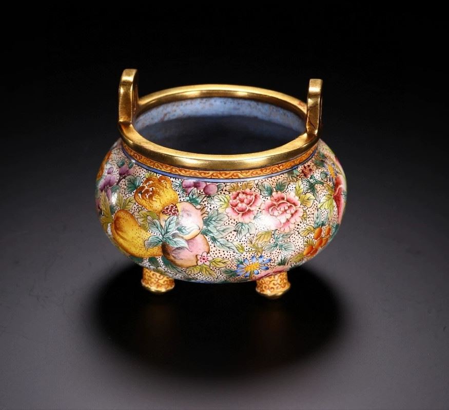 This incense holder is crafted from copper with painted enamel decoration, featuring vibrant floral and fruit motifs symbolizing abundance and good fortune. The exquisite form and fine craftsmanship combine practicality with artistic value.