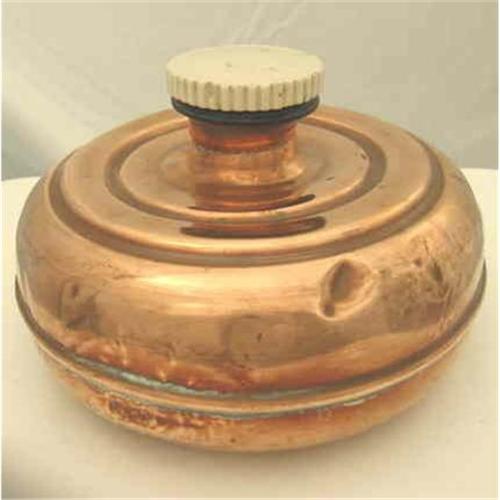 Rich old patina on a solid copper "sliding" bed warmer. (It is filled with boiling water and slid between the cold sheets.) The screw top is heavy pottery that is glazed and marked, "Fill To Brim." Great display piece. c1900.