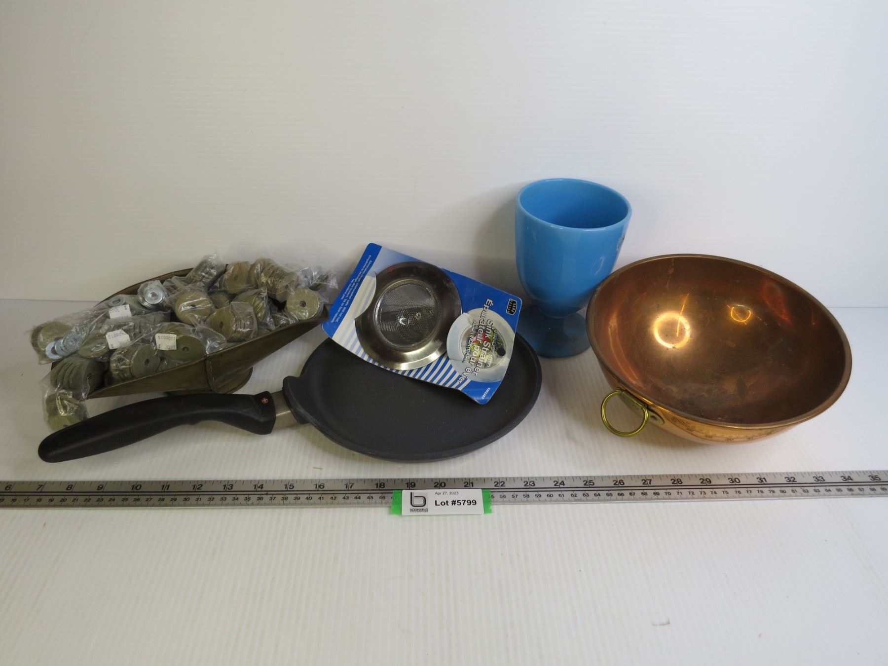 Copper Bowl - Large Egg Cup - Swiss Diamond Frying Pan - Cardboard Washers - Sink Strainer