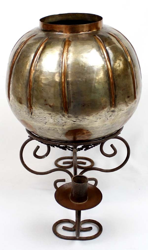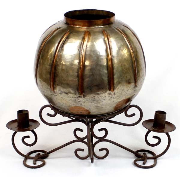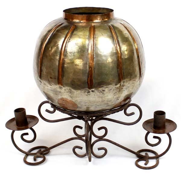 Copper Bowl on Hand Wrought Candleholder Stand, bowl measures 9'' x 9'', stand measures 15''L x 5.5''H x 8''W