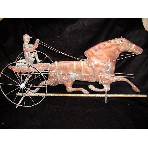 C.1900 delightful copper and brass detailed horse and wagon is driven by the owner in cap with intricate details as well. Brass overlay on birdle,strappings and rod. Originally the top of a weathervane from a large horse farm. Can easily be used for that purpose again with addition of a rod. However,makes a super accent piece all on its own. The bottom extensions hold the piece upright. Measures 31L X 16H X 9W. Excellent condition.