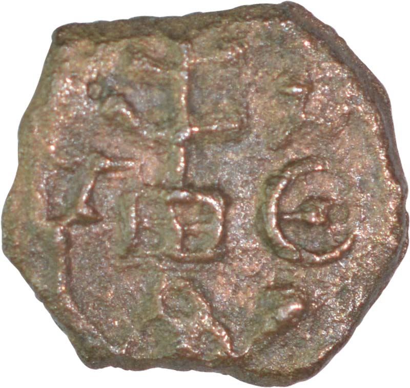 “suktimati”,Rev:tree in railing above six arched hill, indradvaja left, wheel and tarion right, 1.58g, 13.66mm, aboutextremely fine, Extremely Rare.