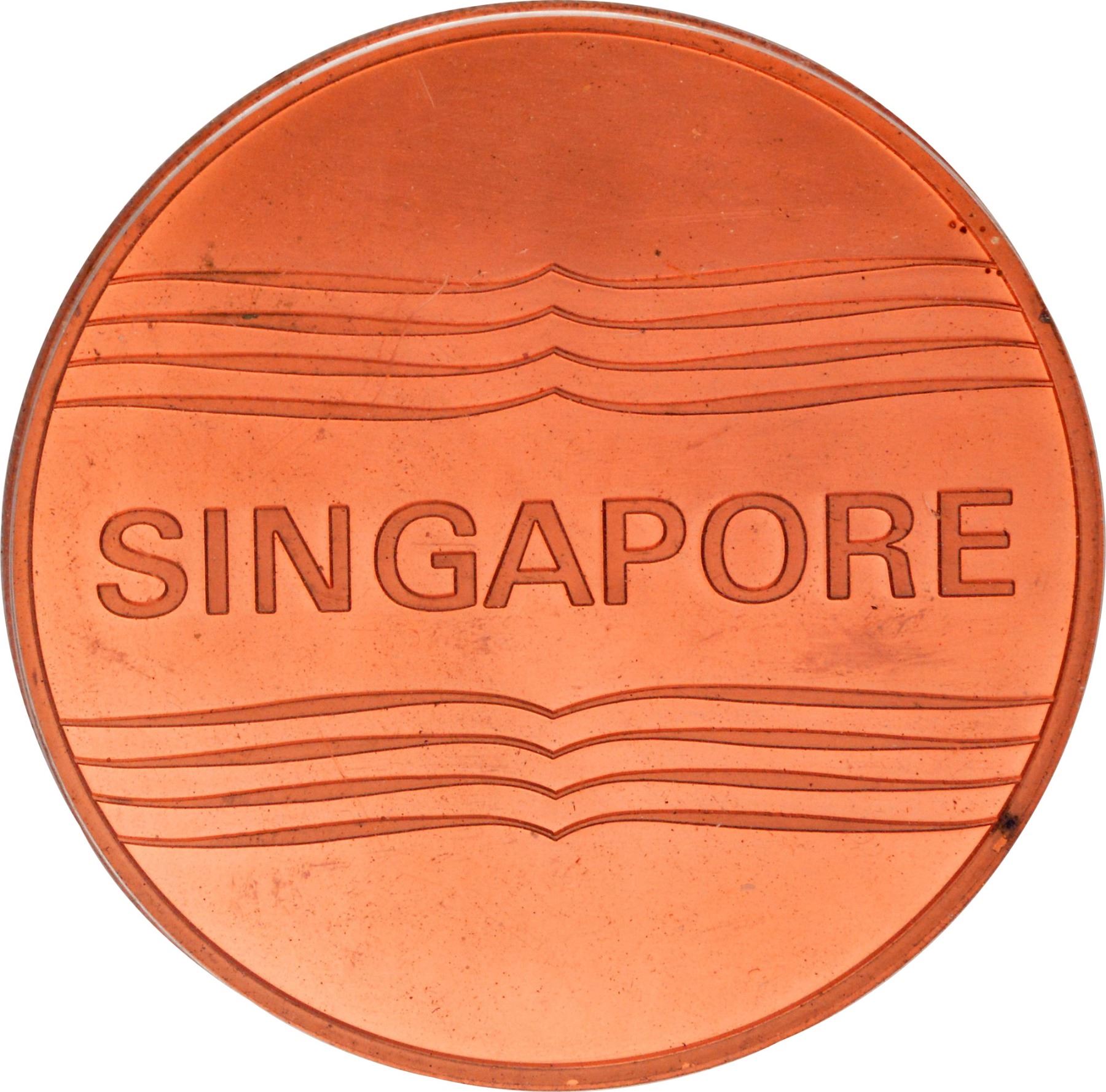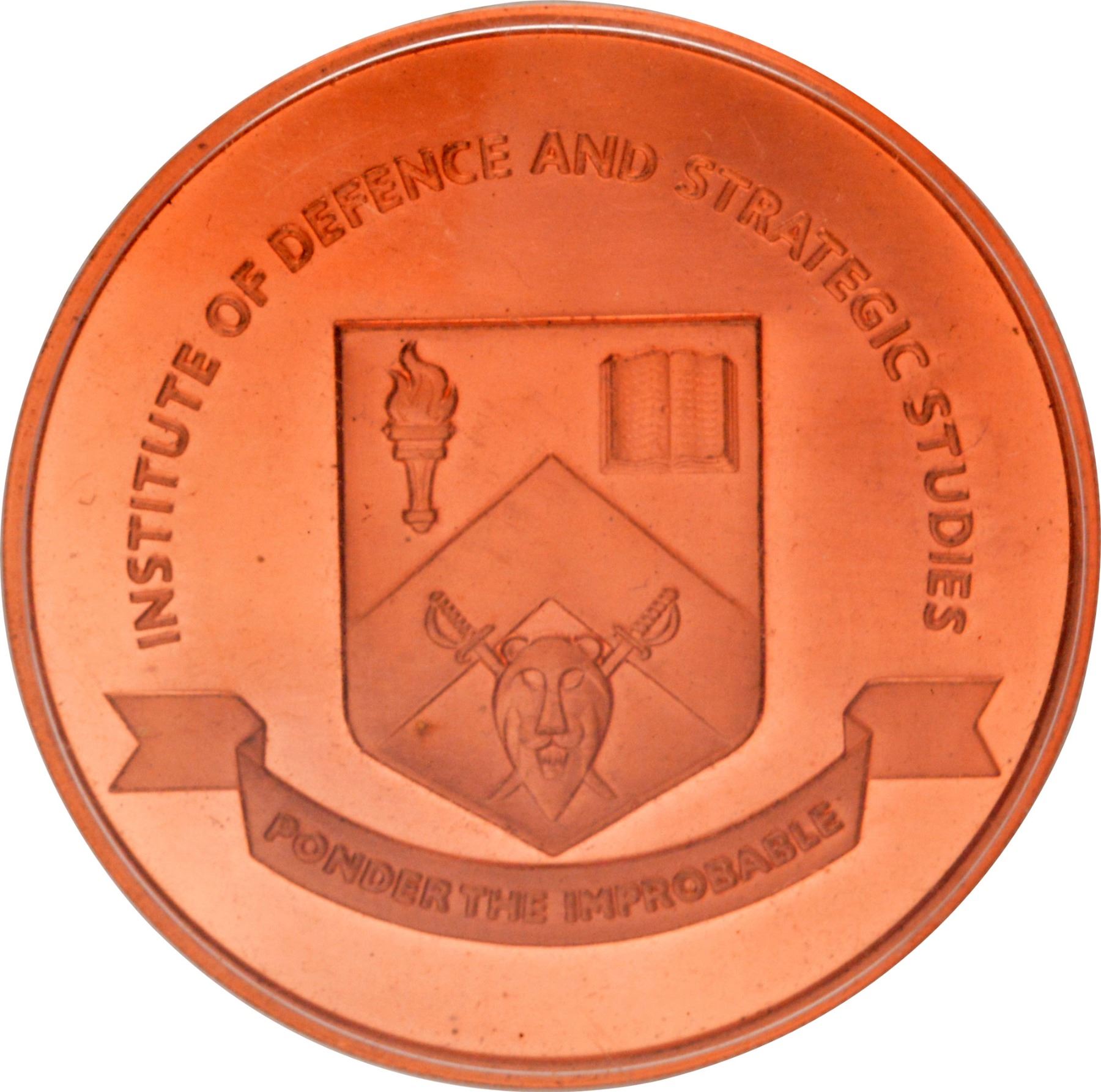 Medallion, Singapore, Institute of Defence and Strategic Studies (IDSS), Copper Chevron Lion Medallion, Obv: a shield in the center, superimposed by a bearded lions head in guardant position, a open book and a lightened torch, legend Ponder the Improbable below on the ribbon, lettering above, Rev: country name, original packing in blue rexine box,approx. 180g, 62mm, UNC.