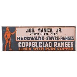 Copper-Clad Ranges embossed tin sign, Jos. Manier, Versailles, Ohio, shows The Copper Clad Crank, VG condition, 28"W x 10"H.