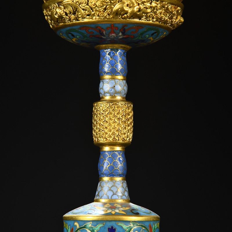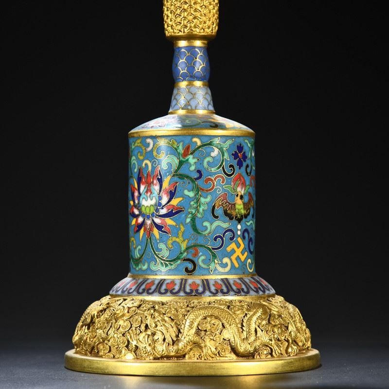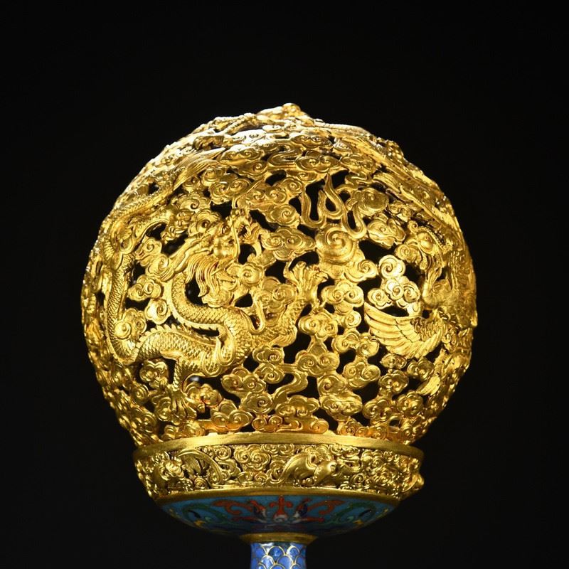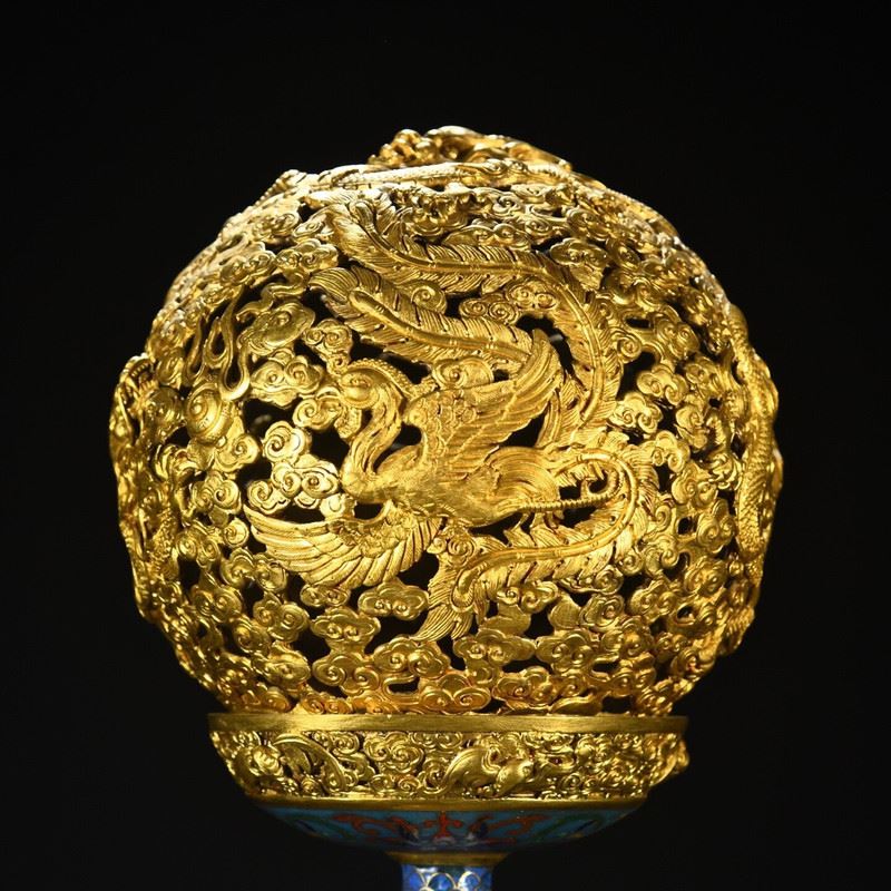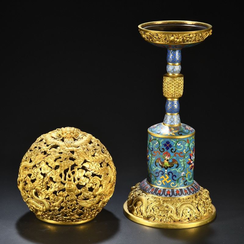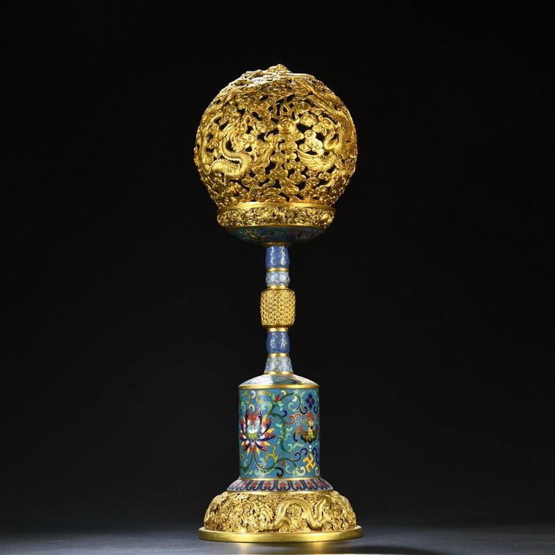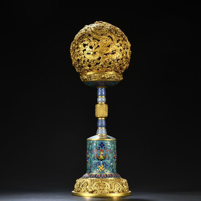 This copper cloisonné enamel inlaid dragon and phoenix incense burner ornament showcases the grandeur and exquisite craftsmanship of Qing Dynasty imperial art. The body of the incense burner is made from copper, with intricate cloisonné enamel and cloisonné wirework, featuring vibrant dragon and phoenix patterns symbolizing auspiciousness and harmony. The fine gilded accents and decorative patterns complement each other, highlighting the luxurious design of traditional art. This piece is not only functional but also highly artistic, making it a highly collectible imperial treasure.