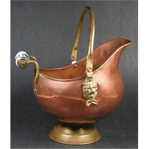 This copper coal scuttle features a brass foot and a brass handle across the rim which is attached on either side by a brass lion's head, and another curved brass attached handle at the back, which bears a lovely blue and white Delph porcelain grip. The body of the coal scuttle is lustrous copper. The height is 7 1/4 inches from the base of the foot to the tip of the spout and with the exception of some wear, due to age, The condition is excellent.