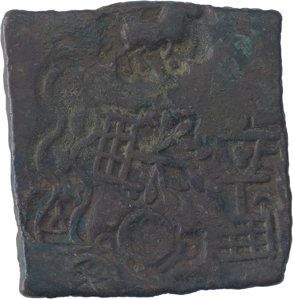 City State of Eran, Copper Unit, Obv:railed tree in centre, horse running to gith ujjain symbol on right, railed indra-dhvaja on top two river with fishes flowing in it at bottom and left,Rev:blank,10.07g, 24.71 x 23.34mm,(W.Pieper # P.no 234, Coin no 467),about extremely fine,Rare.