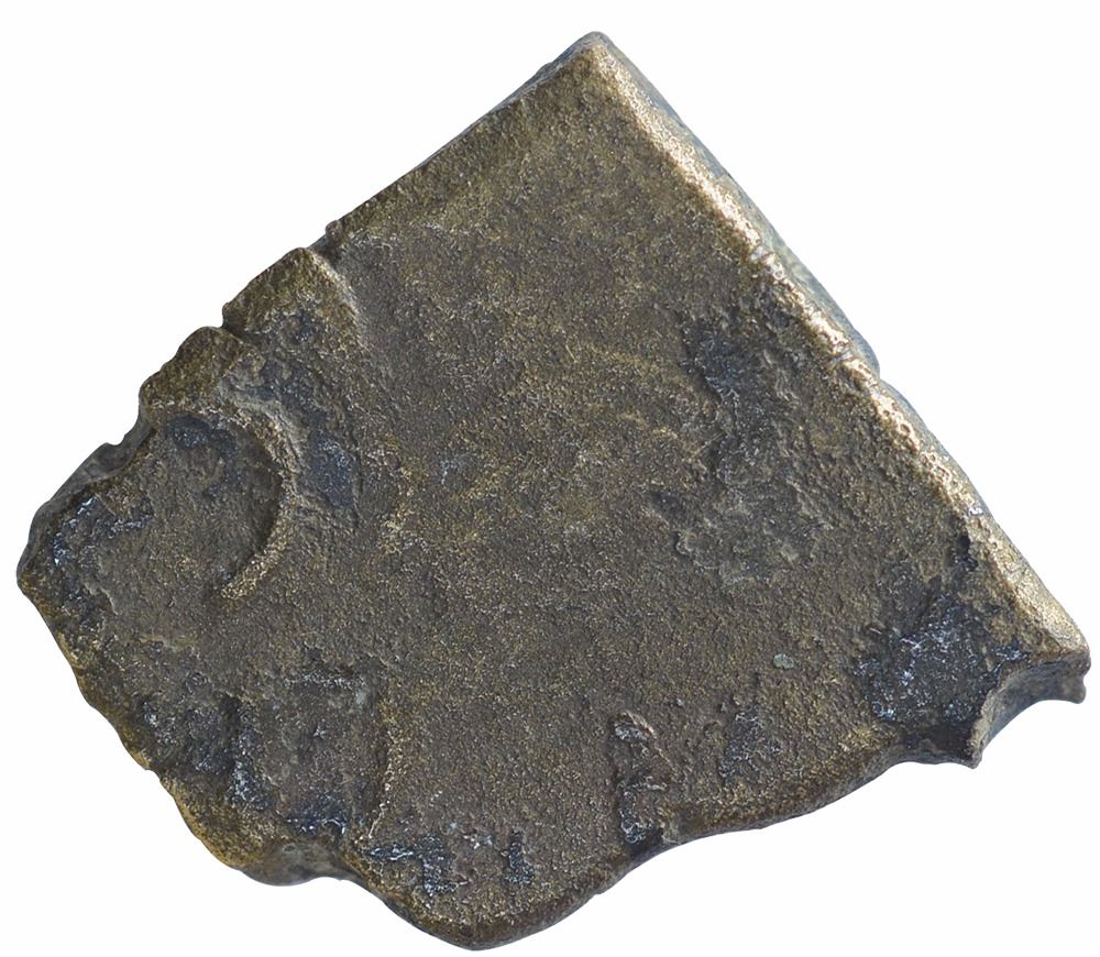 Satavahanas, Kotalingala (Andhra) Region, King Samigopa, Copper Unit, Obv: indradvaja top, tree railing bottom, brahmi legend from left to right in horizontal rano sa mi go pa,Rev: nandyawarta symbol (four nandipadas around a central circle) in very stylized design off flan,1.16g, 11.18mm, about extremely fine.