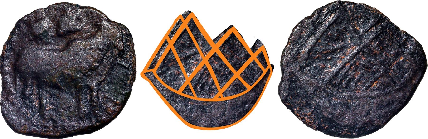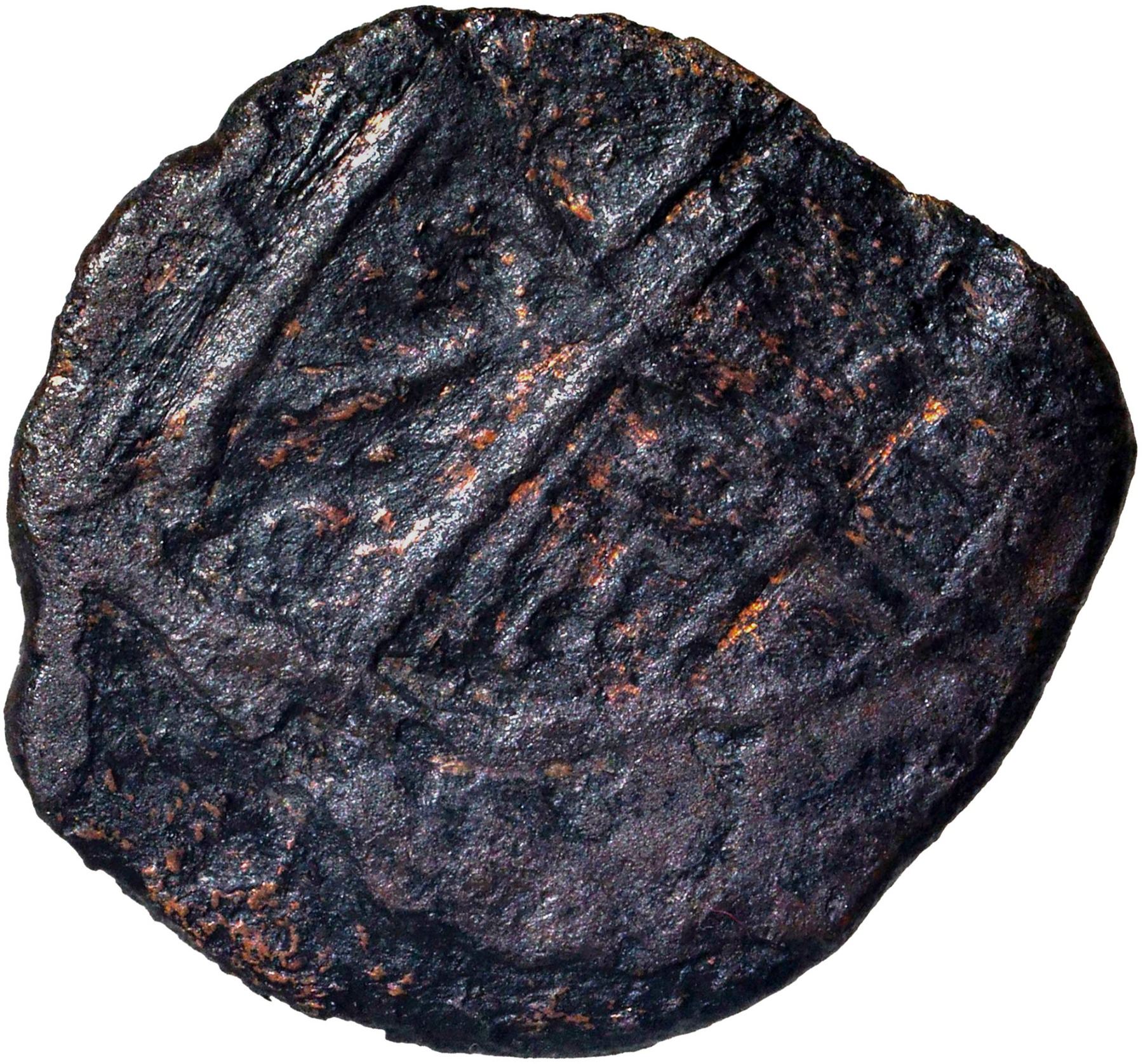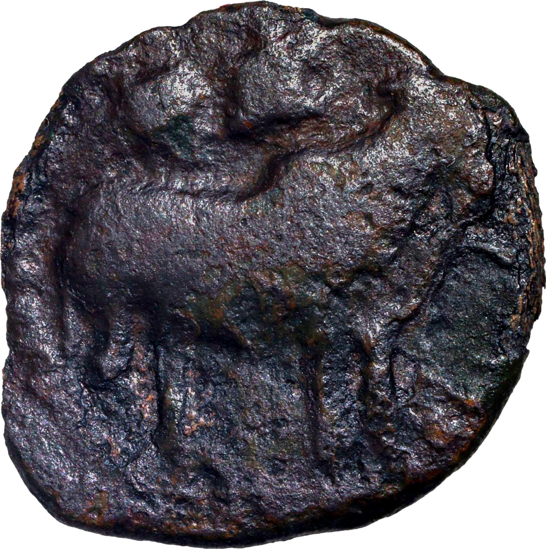 Pallavas of Kanchi (300-500 CE), Copper Unit, Ship type, Obv: an upright bull facing right, a Srivatsa and a conch-shell (Shankha) above, a dotted border around the field, Rev: a ship in the river, 2.1g, 16.21mm, (Unlisted), about very fine, Very Rare.