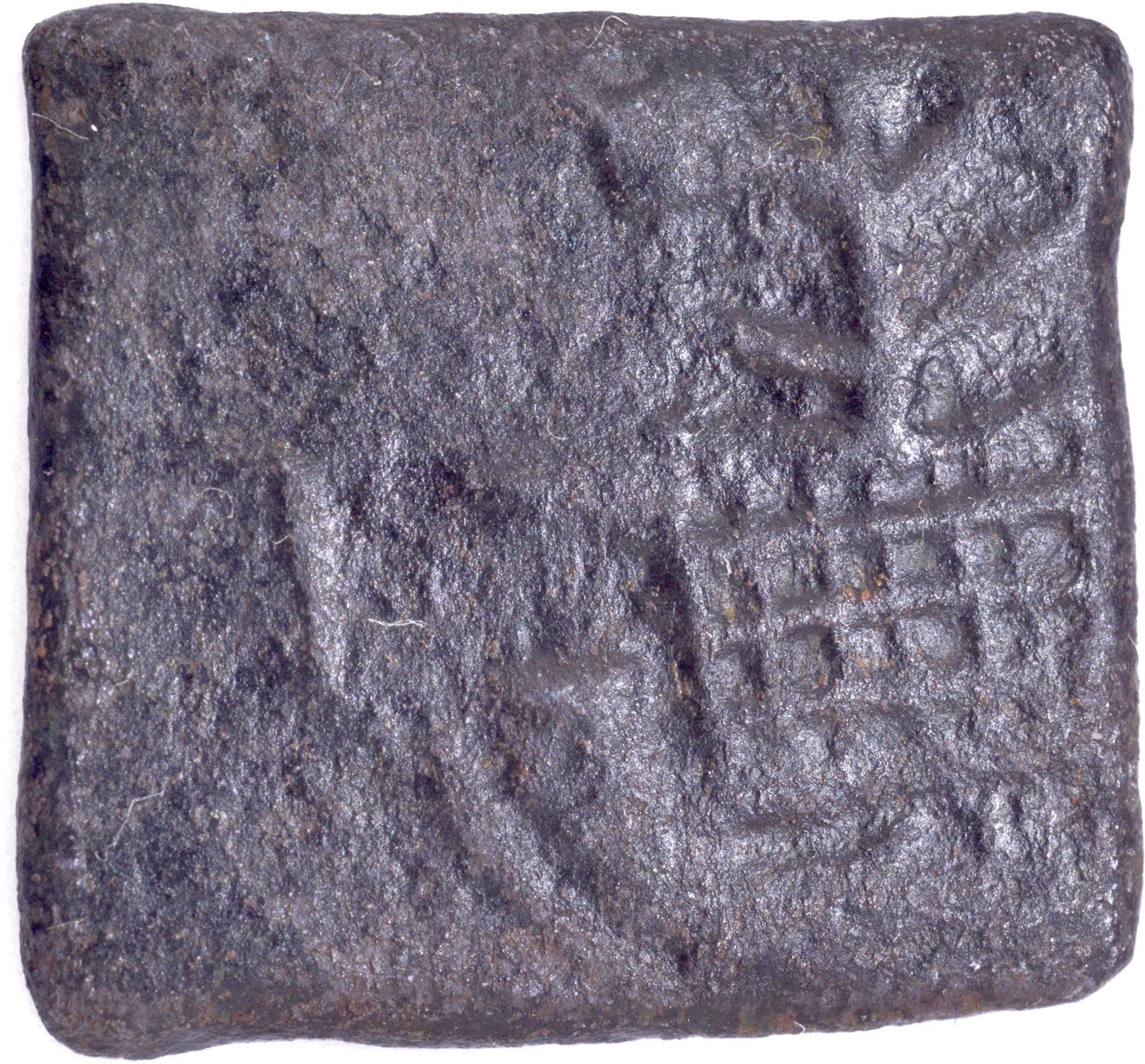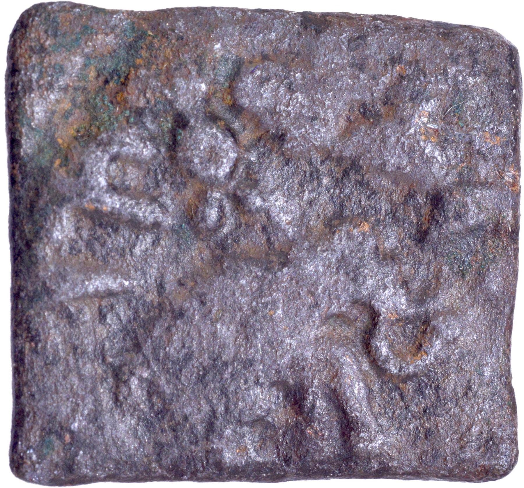 Satavahana Dynasty(100 CE),Copper Unit, Obv: an elephant walking to the right, the Brahmi legend Rajno..... above, Rev: a tree within railings and a river below,2.68g, 17.75x16.26mm,about very fine, Rare.