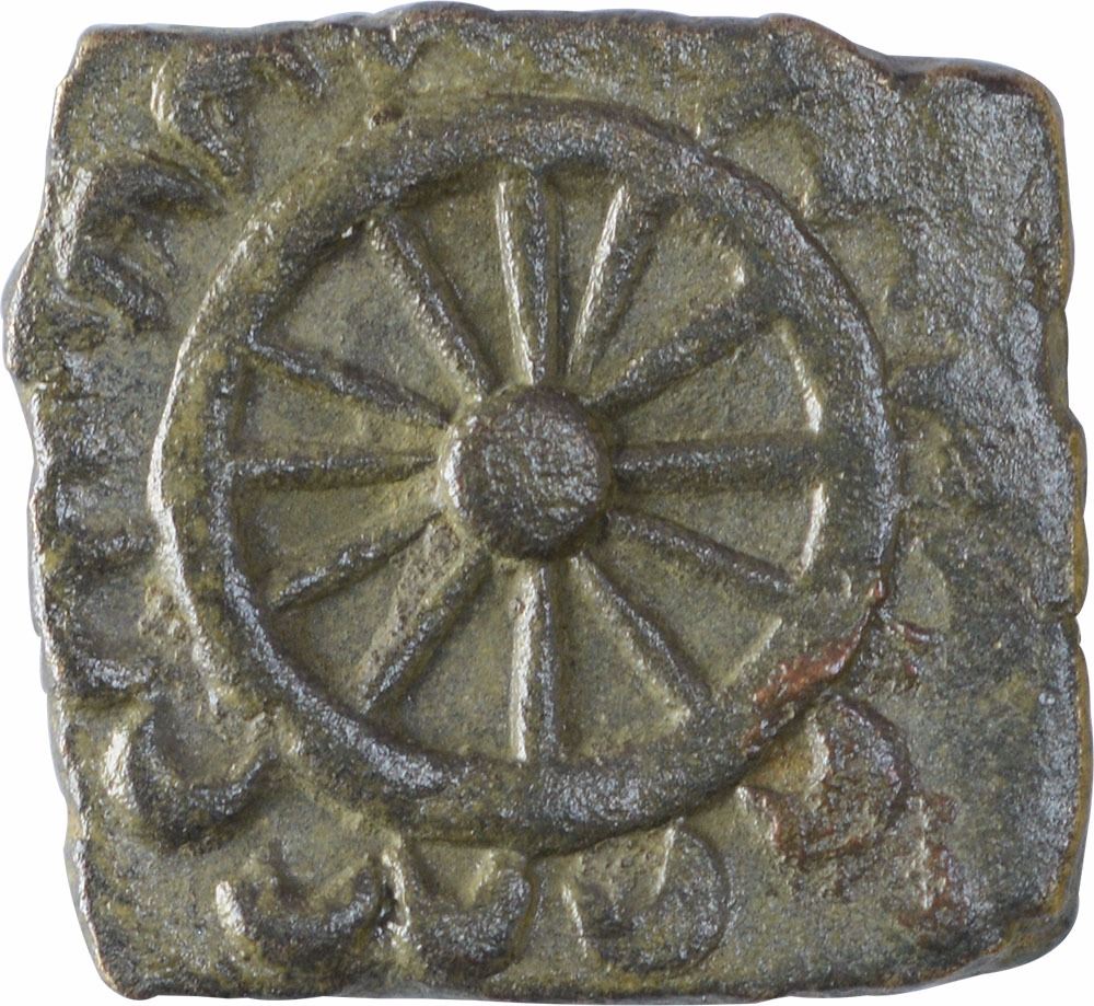 Satavahana Dynasty, Satkarni I (100 BC), Copper Unit, Daunath Region, Obv: armed wheel (chakra) with several spokes, Rev: tree in railing, 1.05g,9.97 x 10.69mm, about very fine, Scarce.