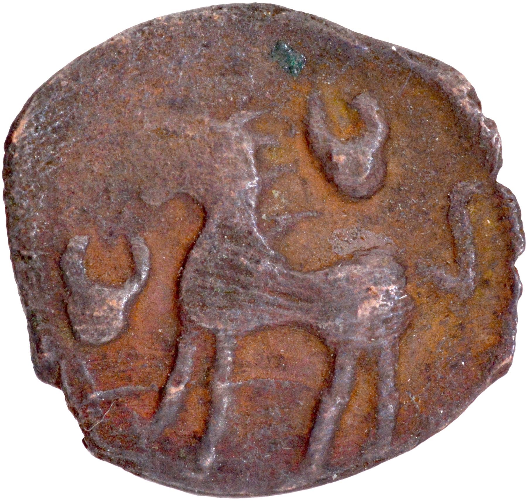 Post-Mauryan, Taxila (Punjab) – Local Coinage (185-168 BC), Copper Unit, Lion type, Obv: a lion standing facing left with upraised tail, a taurine symbol above and in front of the lion, Rev: traces of an elephant standing, 1.04g, 16.6mm, (Unlisted), about very fine, Extremely Rare.