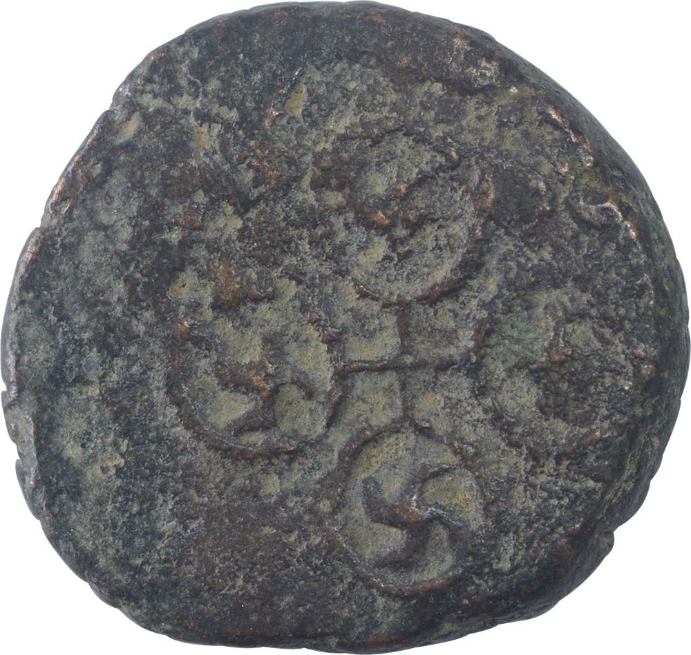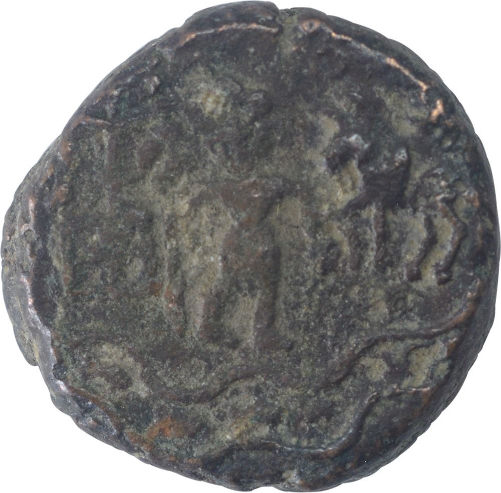 Ujjain Region, Copper Unit, Obv:mahakal standing facing right with staff Kamandalu, Bull right, Tree railing behind,ujjaini symbol, svastika on bull,Rev:ujjain symbol with svastika in arbs,4.83g, 16.65mm,(Ujjaini Coins by D. Rajgor, RB # 43),about very fine.