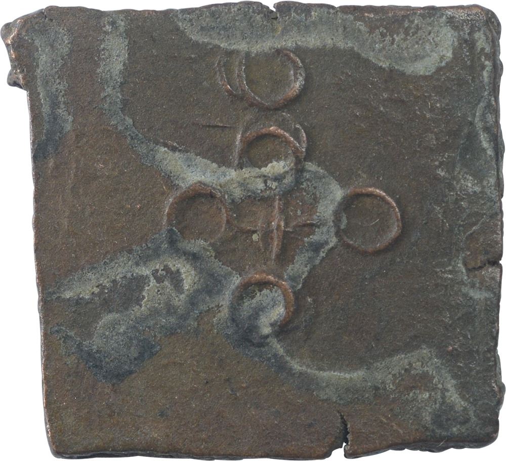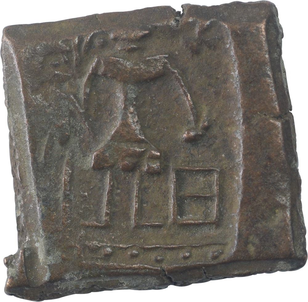 Ujjain Region, Copper Unit, Obv:tribal human figure standing facing, double compartment railing right, trail path bottom,Rev:ujjain symbol with double strike,3.69g, 17.06 x 15.88mm,choice extremely fine,Rare.